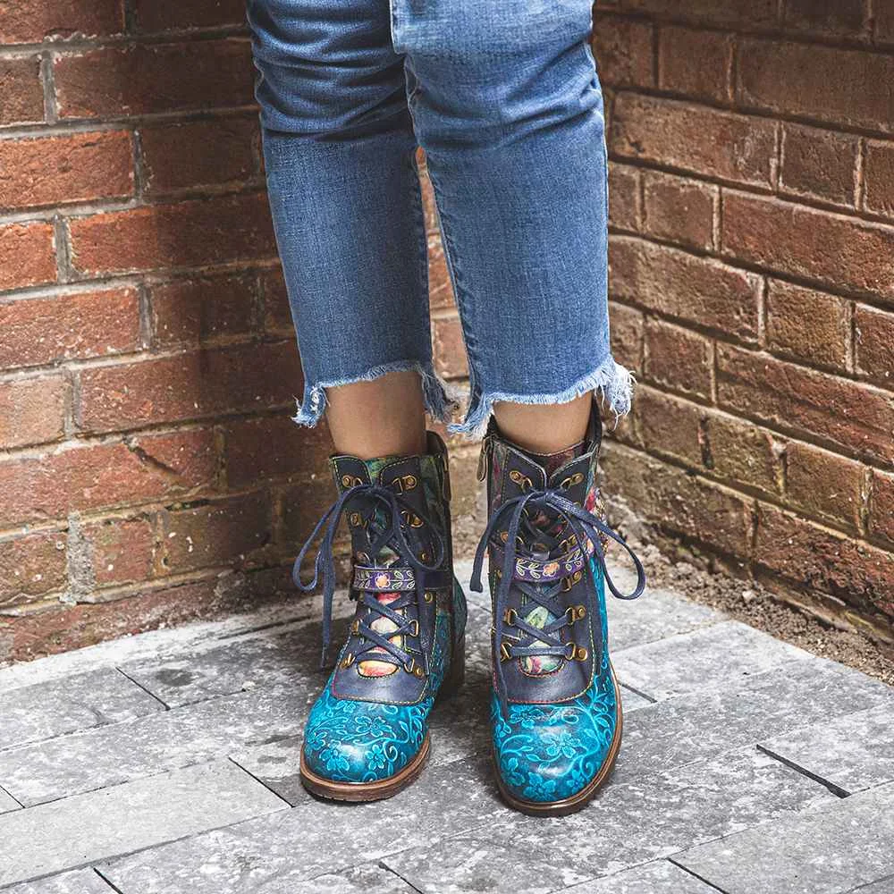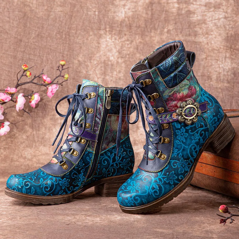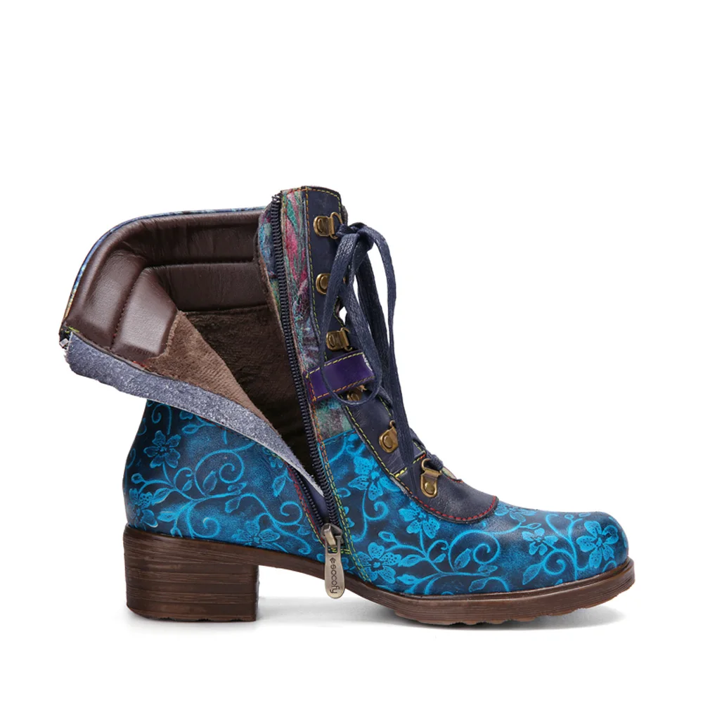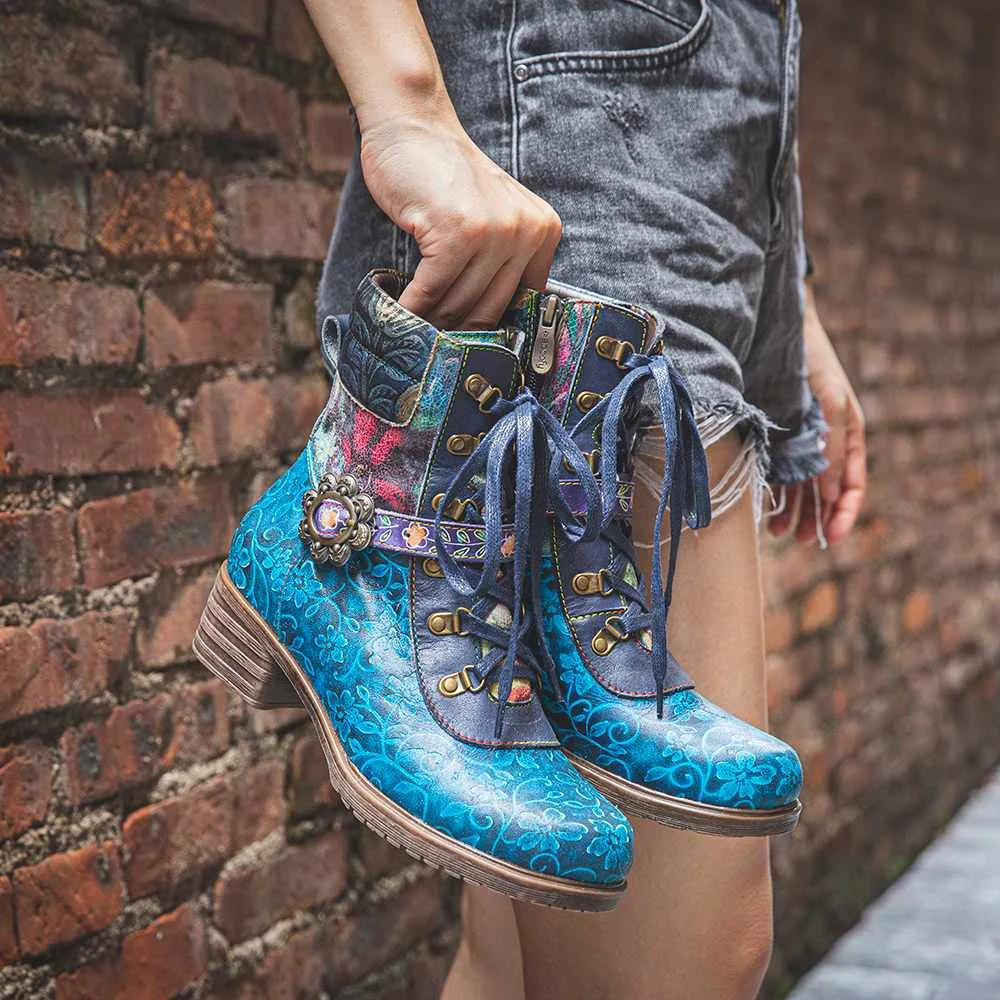 Socofyкороткие ботинки из натуральной кожи в стиле ретро с цветочным принтом, на шнуровке, с боковой молнией, на не сужающемся книзу массивном каблуке; Женская обувь на каблуке; Сезон осень-зима