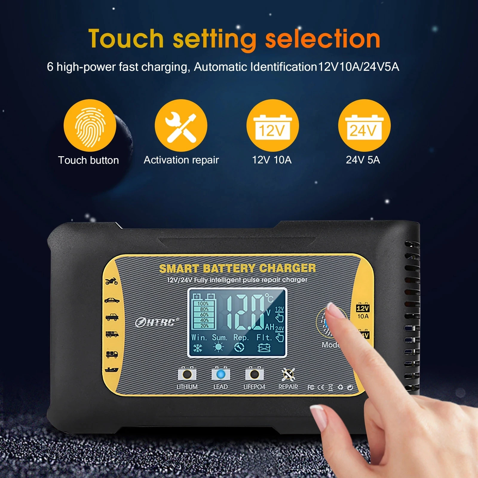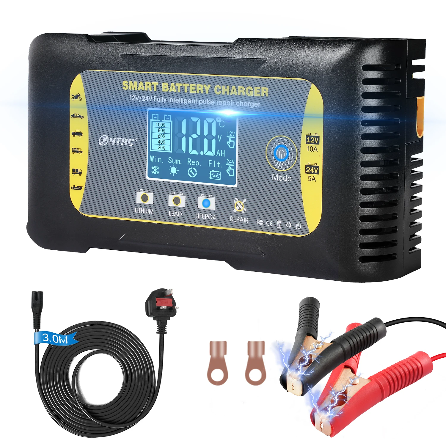 Автомобильное зарядное устройство HTRC 12 В24 В 10 А для литиевых, свинцово-кислотных, свинцово-кислотных аккумуляторов LiFePO4 AGM, зарядное устройство для мотоциклов
