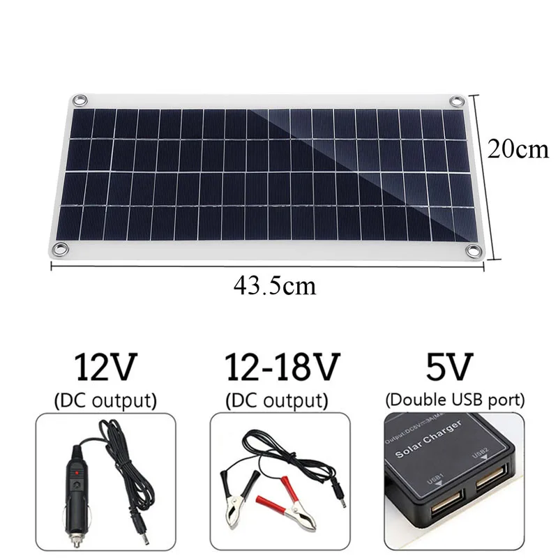 Спецификация:Материал: поликремниевый силиконовый элементВыход USB: 5 ВКоличество порта USB: двойнойНапряжение солнечной панели: DC12-18VМощность солнечной панели: 300 ВтТок контроллера: 10A/20A/30A/40A/50A/60A/80A/100AРазмер: 43х20смПодходит для: велоспорта, альпинизма, пешего туризма, кемпинга, путешествий и т. д.