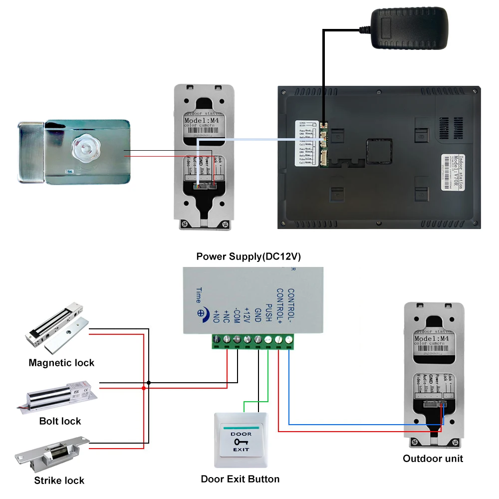 (Замок без типа может быть подключен к камере напрямую. Но магнитный замок, Блокировка удара и блокировка болтов должны быть подключены к дополнительному источнику питания DC12V.) Если вы хотите установить Электрический магнитный замок, strike lock, bolt lock на камеру, нужно купить источник питания DC12V. (Оба источника питания, замки, кнопка выхода двери не включены в посылка)