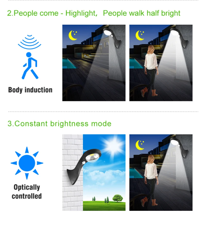 2. Индукция человека + светильник управления: автоматически Включите светильник в ночное время и выключите светильник в дневное время. Диапазон освещения 120 °, Индукционное расстояние 3-5 метров.