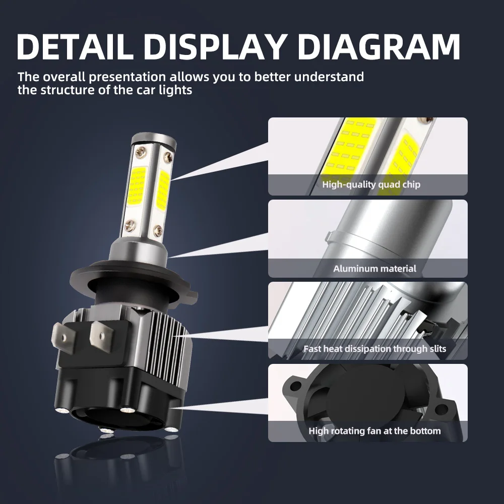 Название: 4 стороны светодиодные лампы фар автомобиляМощность: 50 Вт/пара, 25 Вт/лампаСветовой поток высокой эффективности: 5000лм/пара, 2500лм/лампаКласс водонепроницаемости: IP68.Напряжение: 9 В до 36 В (подходит для автомобилей 12 В). Широкий диапазон напряжения, постоянное управление уррентом, защита от помех.Применение: обновление для автомобилей, грузовиков, внедорожников, RV HID Ксеноновые фары, все в одном стиле, не требуется дополнительный драйвер.Дальность: 200 м дальность света.Сверхяркие рекламные щиты, со всеми 4-сторонняя светодиодная лампа, 360 градусов освещения, без темных пятен, без слепых зон.Дальний/ближний свет: H4/9003/HB2 дальний/ближний светОдинарный свет: H7 H11/H9/H8 9005/HB3 9006/HB4Пожалуйста, попытайтесь отрегулировать лампы, чтобы получить лучшую световую картину при установке.Применяются для: фар (дальнего света, ближнего света); Противотуманных фар; Фар мотоцикла.Упаковка: 2 светодиодных лампы для фар