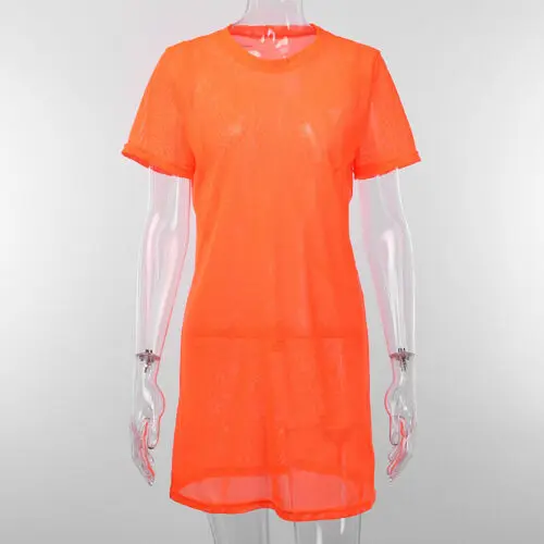 Однотонные повседневные свободные футболки для женщин, неоново-зеленая винтажная Сетчатая футболка с круглым вырезом и коротким рукавом, летний топ, длинные футболки, пляжная одежда