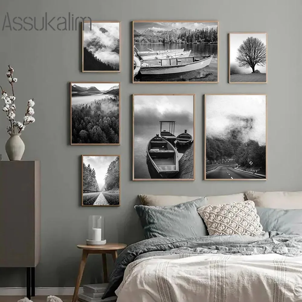 Черно-белый постер, пейзаж, живопись, озеро, лодка, плакаты, принт ...