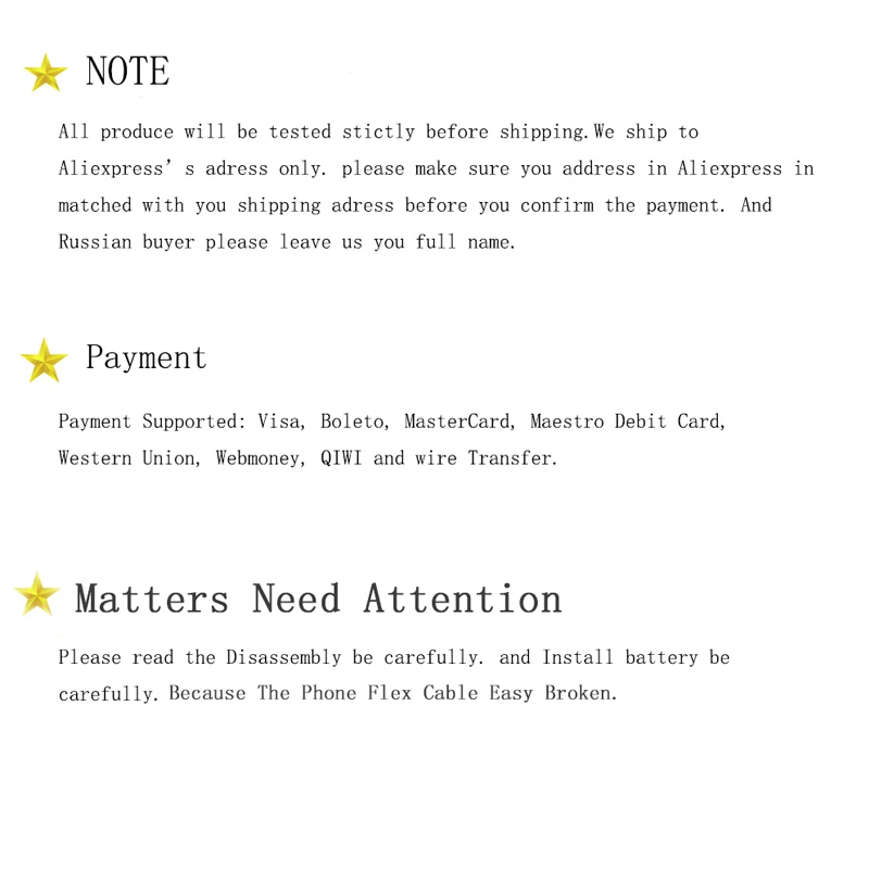 1 мы рекомендуем вам использовать Alipay, который безопасен для нас обоих. Оплата предоставляется только после того, как вы подтвердите, что товар был получен.2 Мы принимаем платежи только через ESCROW, пожалуйста, свяжитесь с нами, если вы запрашиваете другие платежи, такие как Paypal /TT bank / Western Union и т. д. 3. Все основные кредитные карты принимаются через безопасный платежный процессор ESCROW.4. Оплата должна быть завершена в течение 7 дней, пожалуйста, свяжитесь с нами, если у вас есть вопросы по оплате.Во-вторых,1. Доставка по всему миру. (За исключением некоторых стран и армейской почтовой службы/почтовых отделений флота).2. Товары будут доставлены в течение 2-4 рабочих дней после получения оплаты. Если вы хотите изменить доставкуАдрес, пожалуйста, оставьте сообщение.3. Мы отправляем только по подтвержденным адресам заказа. Пожалуйста, убедитесь, что адрес доставки верен перед покупкой,4. Мы не несем ответственности за неправильный или недоставляемый адрес.5. Для бесперебойной и быстрой отправки мы можем отправить товары другому курьеру/перевозчику, решение от нас является окончательным.6. Время доставки определяется перевозчиком и не включает выходные и праздничные дни. Время доставки может меняться,Особенно в сезон отпусков.7. Если вы не получили свой заказ после 30 дней с момента оплаты, пожалуйста, свяжитесь с нами. Мы будем отслеживать ваш заказ иВернитесь к вам как можно скорее. Наша цель – удовлетворение клиентов!8. Если у вас возникли проблемы с доставкой, вы можете проконсультироваться с нами и решить их законно.9. Мы не несем ответственности за несчастные случаи, задержки или другие вопросы, которые являютсяОтветственностьДоставки и любые сборы за импорт являются обязанностью покупателей.В-третьихДля того, чтобы вы платили Бесплатный или меньший налог на импортные товары, мы объявим подарок» с более низкой стоимостью. И эта низкая цена не отражает общую цену, которую вы заплатили или должны заплатить.В-четвертых,Гарантия 1,12 месяцев. Покупайте с уверенностью (за исключением предметов, поврежденных и/или неправильно использованных после получения). АксессуарыПоставляются с 3-месячной гарантией. Все товары, которые мы продаем, находятся в хорошем качестве и в стадии изучения, прежде чем ониДоставляются