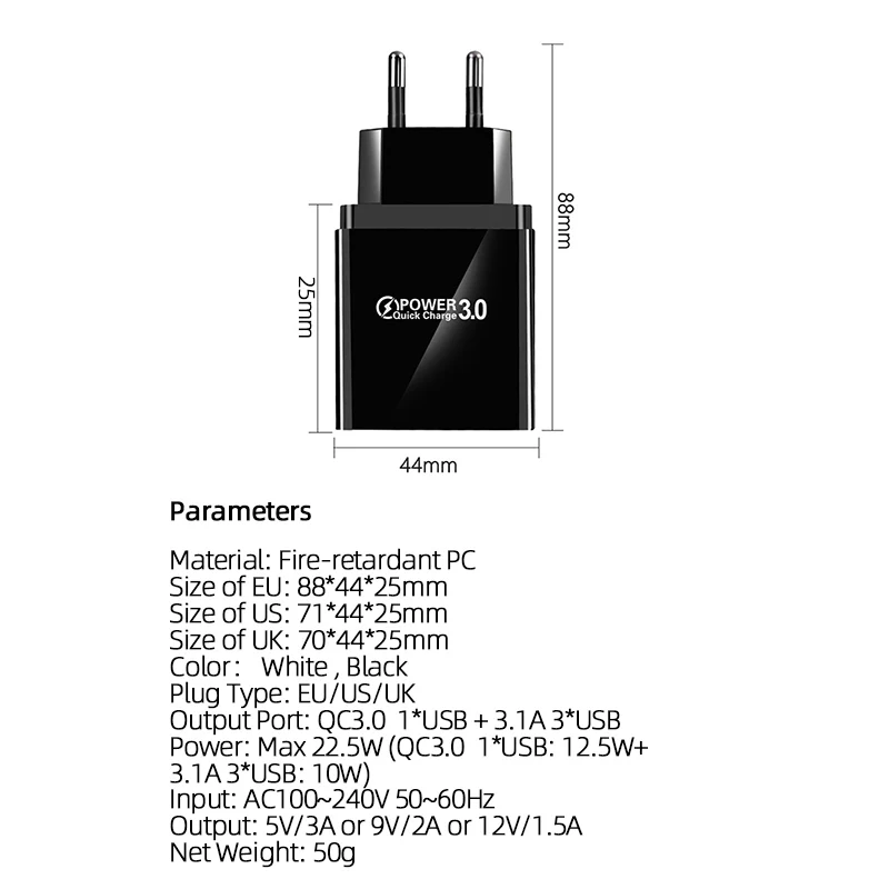 Материал: Огнестойкий ПоликарбонатРазмер ЕС: 88*44*25 ммРазмер США: 71*44*25 ммРазмер Великобритании: 70*44*25 ммЦвет: белый, черныйТип вилки: ЕС/США/ВеликобританияВыходной порт: QC3.0 1 * USB + 3.1A 3 * USBМощность: Макс 22,5 Вт (QC3.0-1 шт. • USB: 12,5 W + 3.1A 3 * Тип разъема для зарядки: USB 10 Вт)Вход: AC100-240V 50/60HzВыход: 5V/3A или 9В/2A или 12V/1.5AВес нетто: 50 гОсобенности:В корпусе используется блестящая оболочка и окислительная обработка, которая красива и не оставляет царапин;Интеллектуальное решение ic, интеллектуальное шунтирование, перезарядка, автоматическая защита от отключения питания;Технология быстрой зарядки 3,0, обратная совместимость с QC2.0;Для устройств, которые не поддерживают быструю зарядку, для быстрой зарядки адаптируется больший ток.