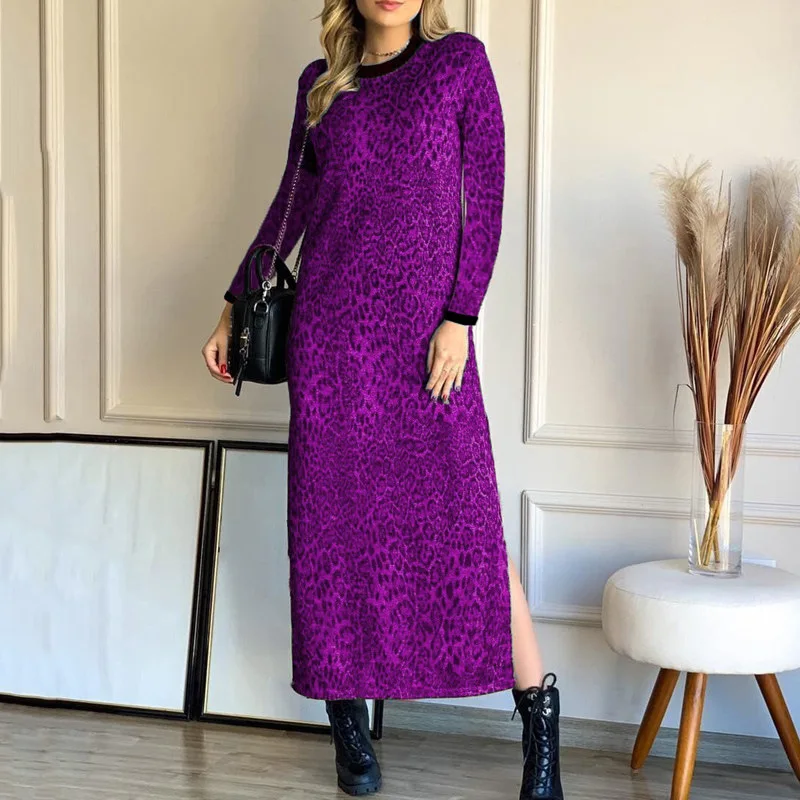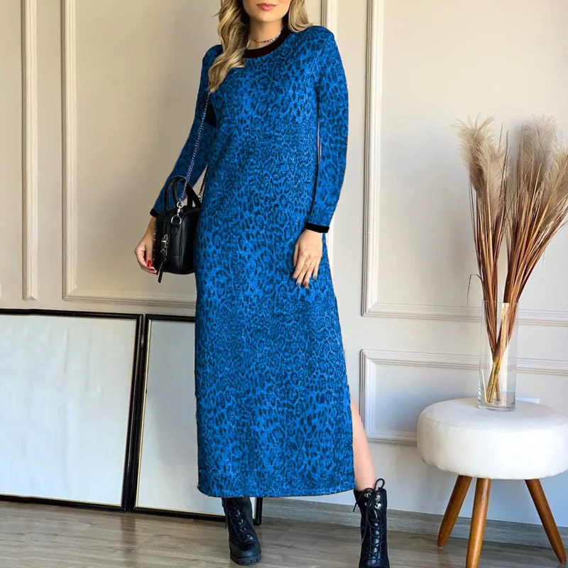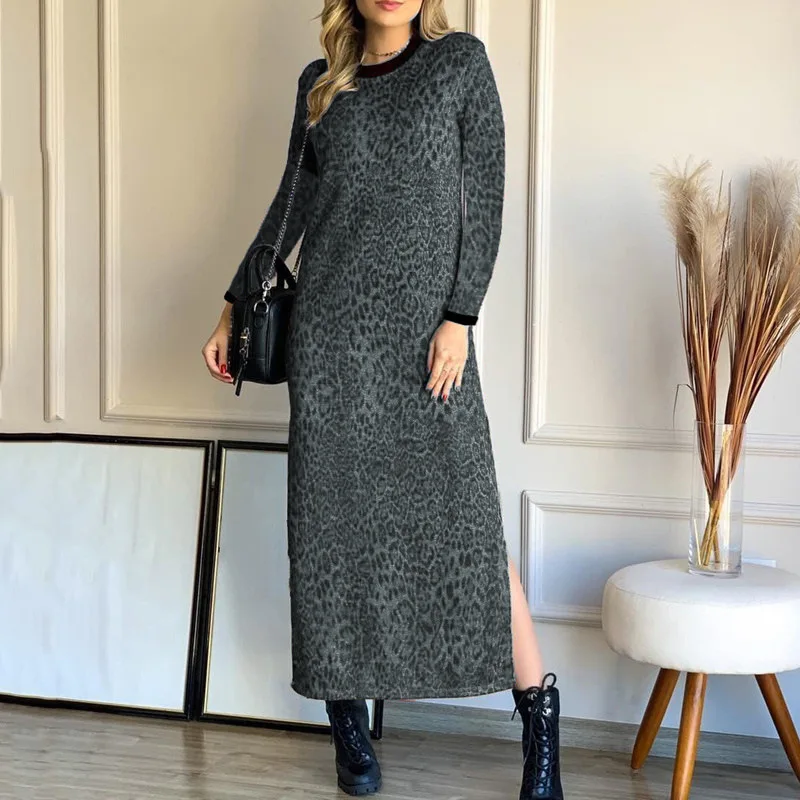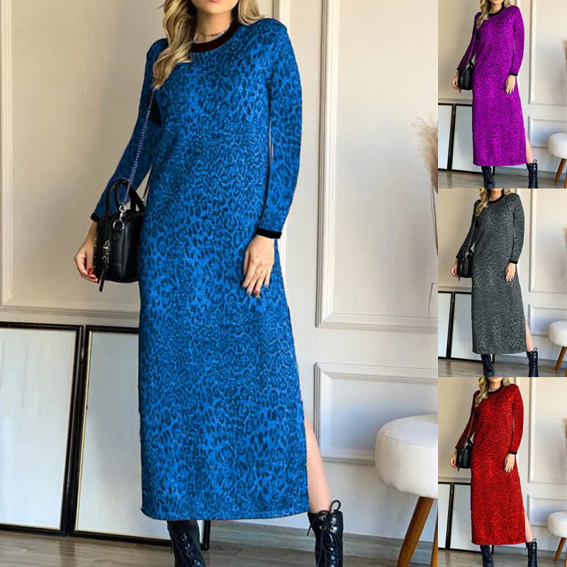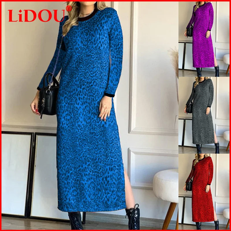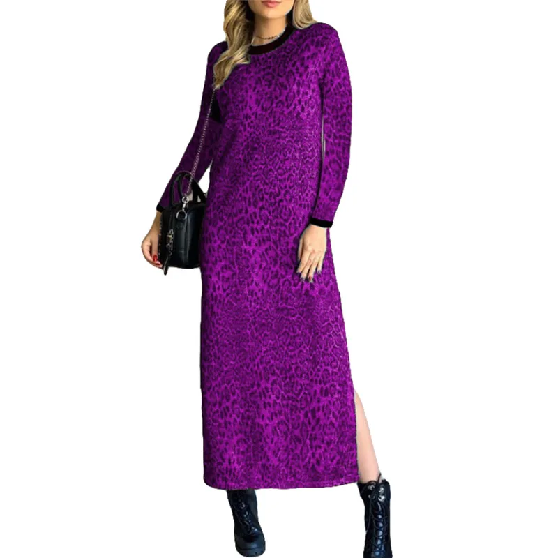 Модное женское Повседневное платье с длинным рукавом и круглым вырезом, с разрезом, длинное платье, женское осеннее платье макси с леопардовым принтом 2021, элегантное платье