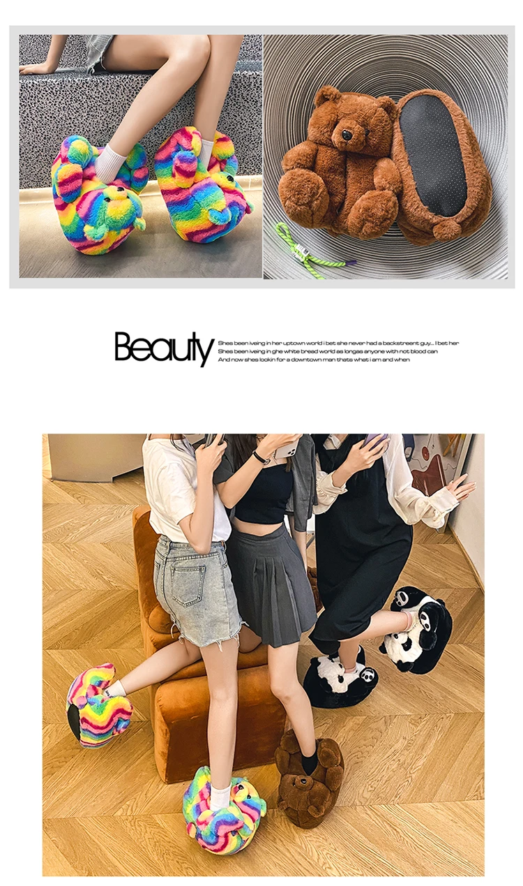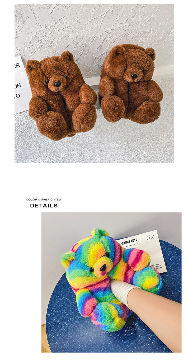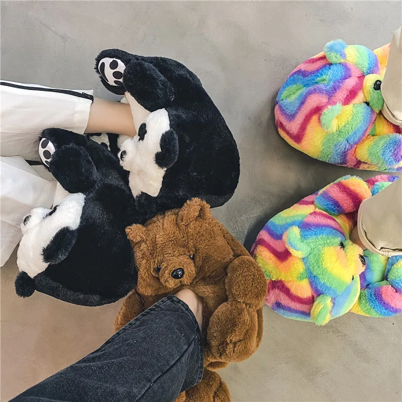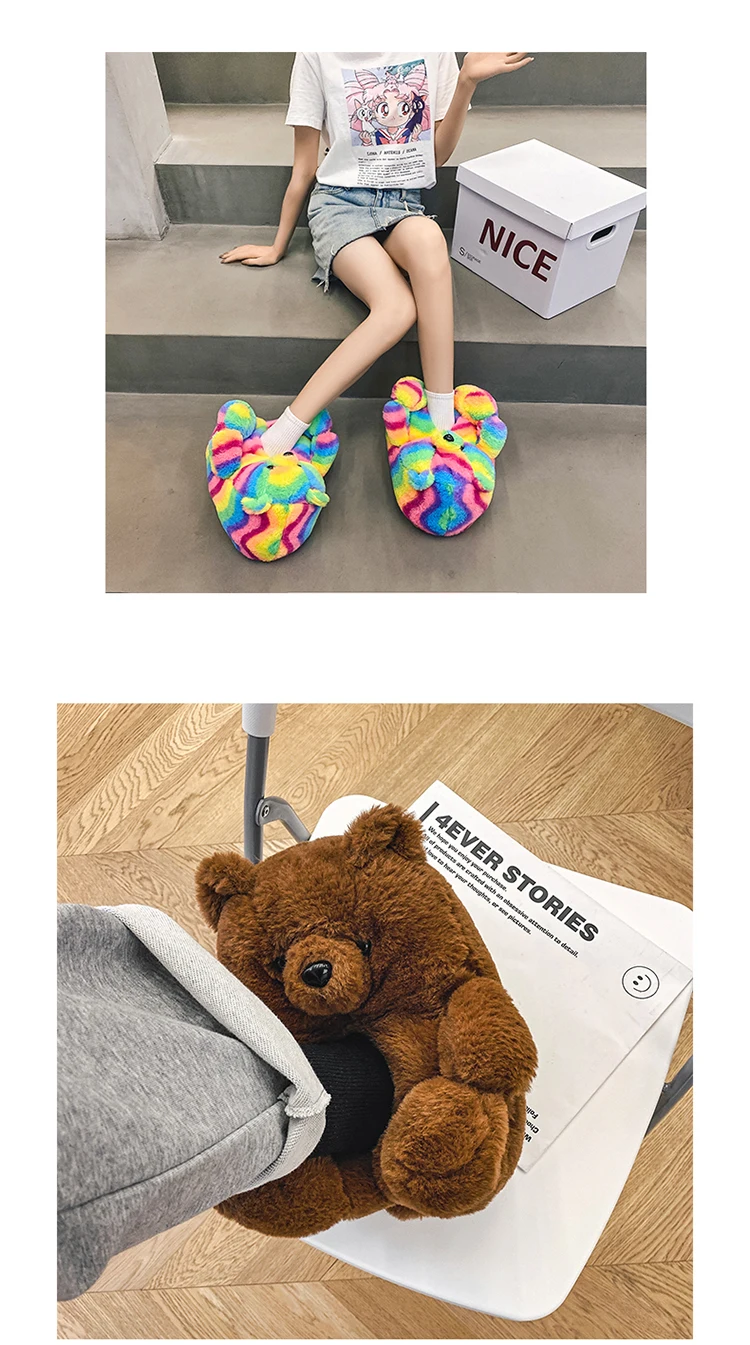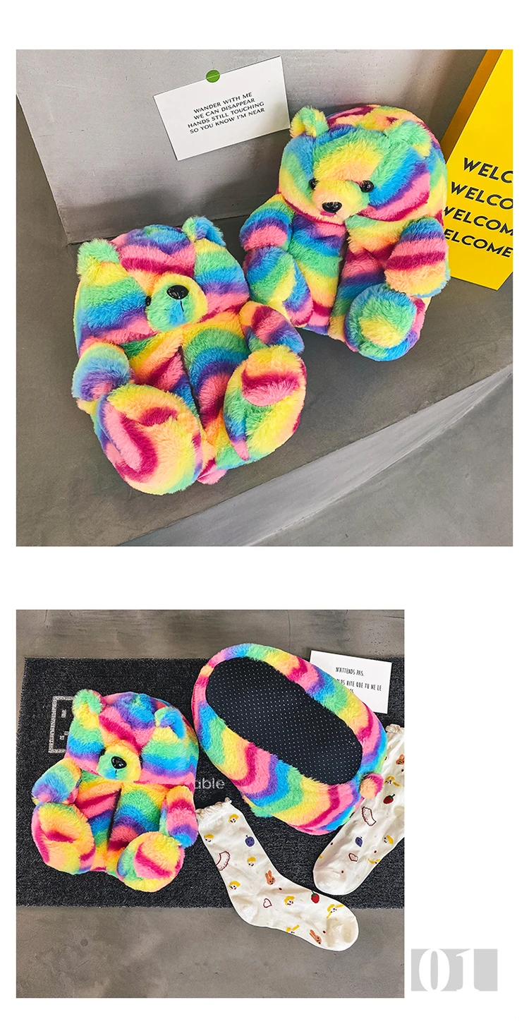 Туфли женские пушистые с радужным медведем, дизайнерские тапочки с пушистым плюшевым мишкой