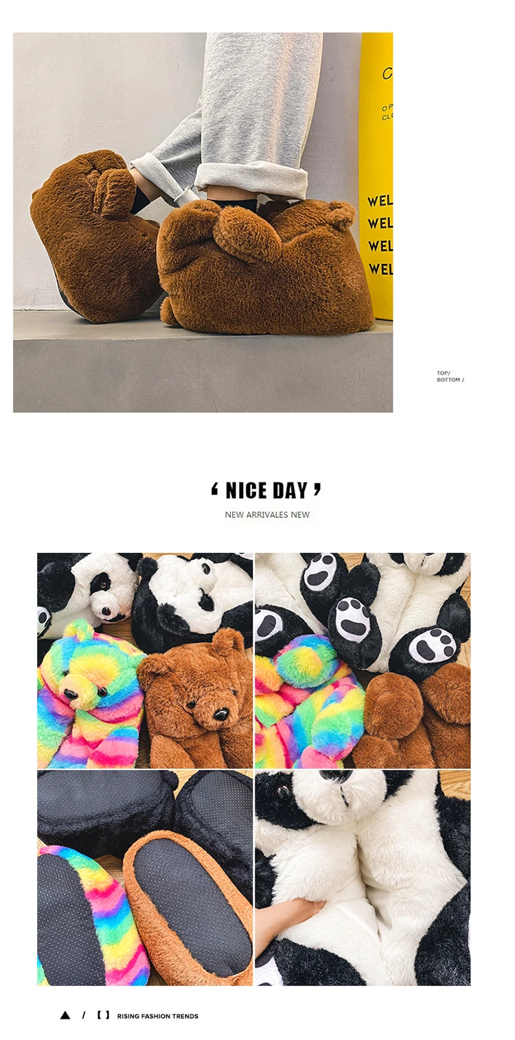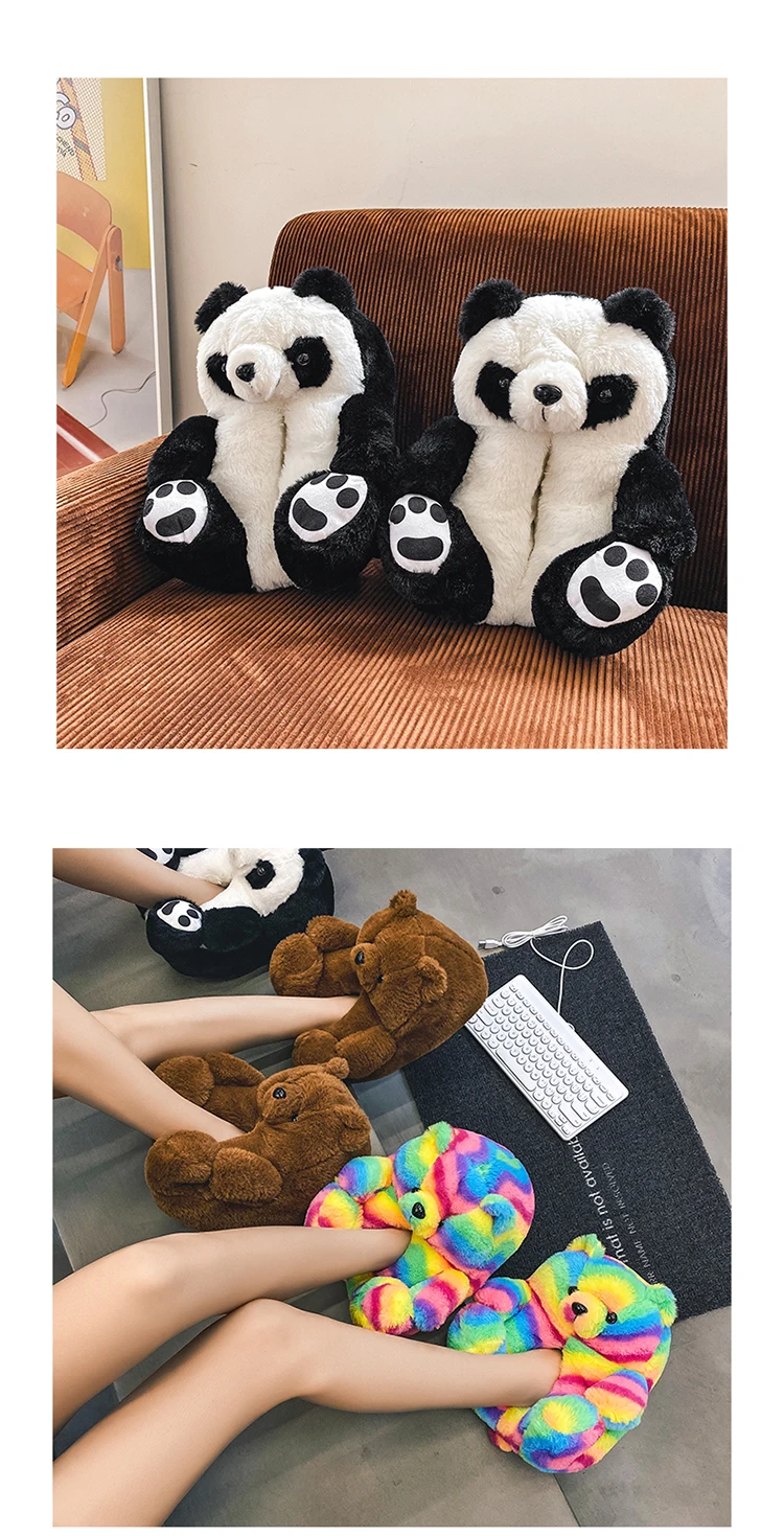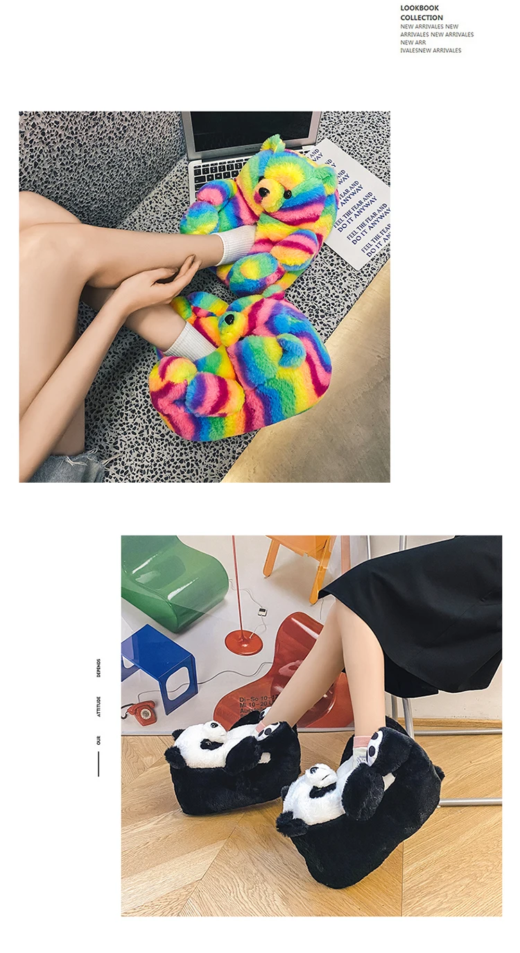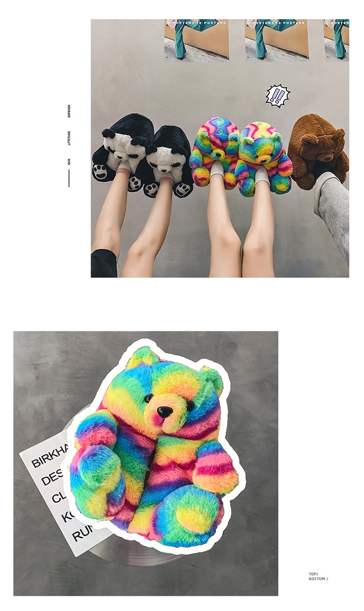Туфли женские пушистые с радужным медведем, дизайнерские тапочки с пушистым плюшевым мишкой