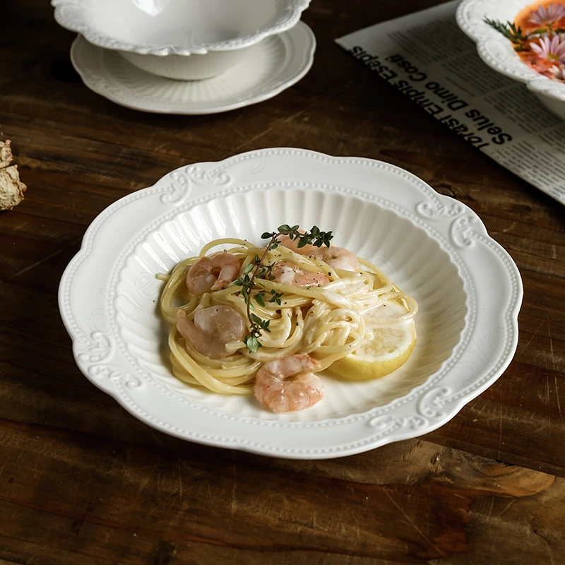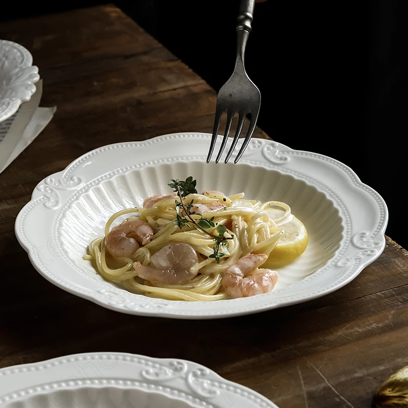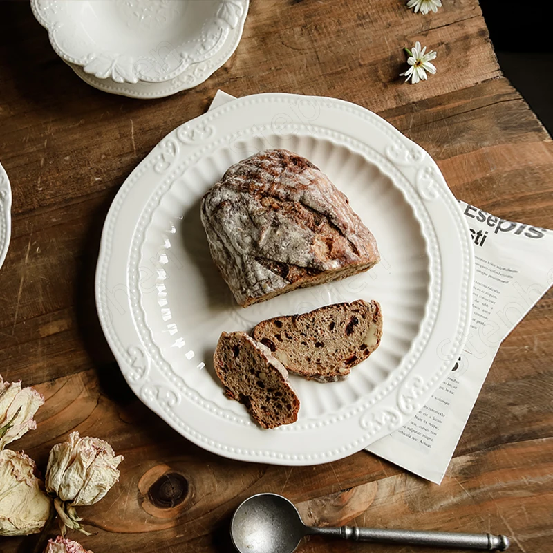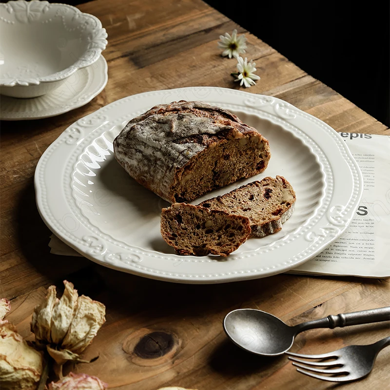 Рельефные стандартные керамические тарелки, французская креативная кружевная белая обеденная тарелка, десертная тарелка в дворцовом стиле, посуда для послеобеденного чая