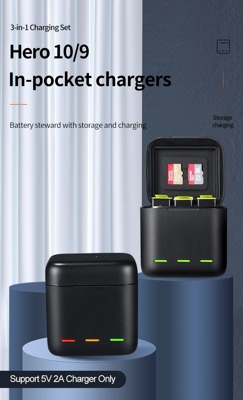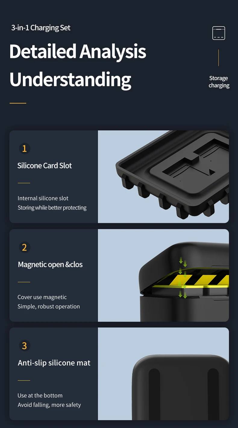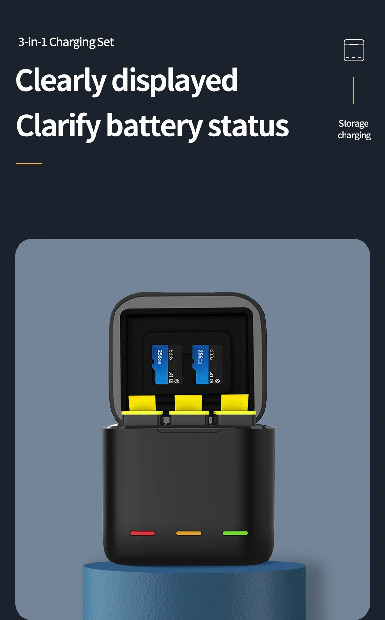1. Большая емкость 1750 мАч, терка, чем Оригинальная батарея2. До 112 мин времени съемки на одной батарее (время использования отличается в разных режимах).3.100% идеально подходит для GoPro Hero 9,Hero 10, без всплывающих окон.4. Зарядное устройство от квадратного до круглого, более удобное на ощупь, как детская кожа.5. Девять защиты, используйте с уверенностью, аккумулятор и зарядное устройство безопасны.6. Три батареи во время зарядки и хранения, вмещает до двух tf-карт и трех батарей.7.2.4 большого тока, Полная зарядка занимает всего лишь 2,5 h.8. Силиконовый слот для карт, сохраняя при этом лучшую защиту.9. Магнитное открытие и закрытие, покрытие использует магнитное, простое, надежное управление.10. Противоскользящий силиконовый коврик, используйте в нижней части, чтобы избежать падения, больше безопасности.11. Интерфейс Type-c, поддержка передних и обратных вставок, не требуется адаптация кабелей.12. Четко отображенный, уточняющий состояние батареи, постоянно включается зеленый светильник, близкий к полноте желтый светильник остается на синем светильник дышит, Зарядка красный светильник остается на синем светильник дышит, В режиме ожидания всегда включен синий светильник.13. Легко помещается в рюкзак, не занимает много места.