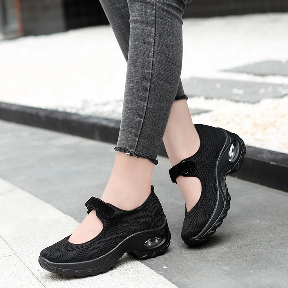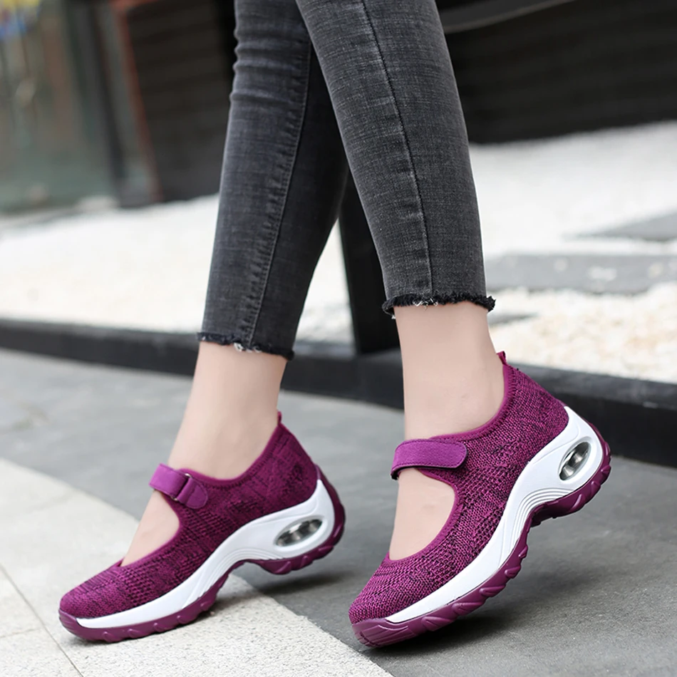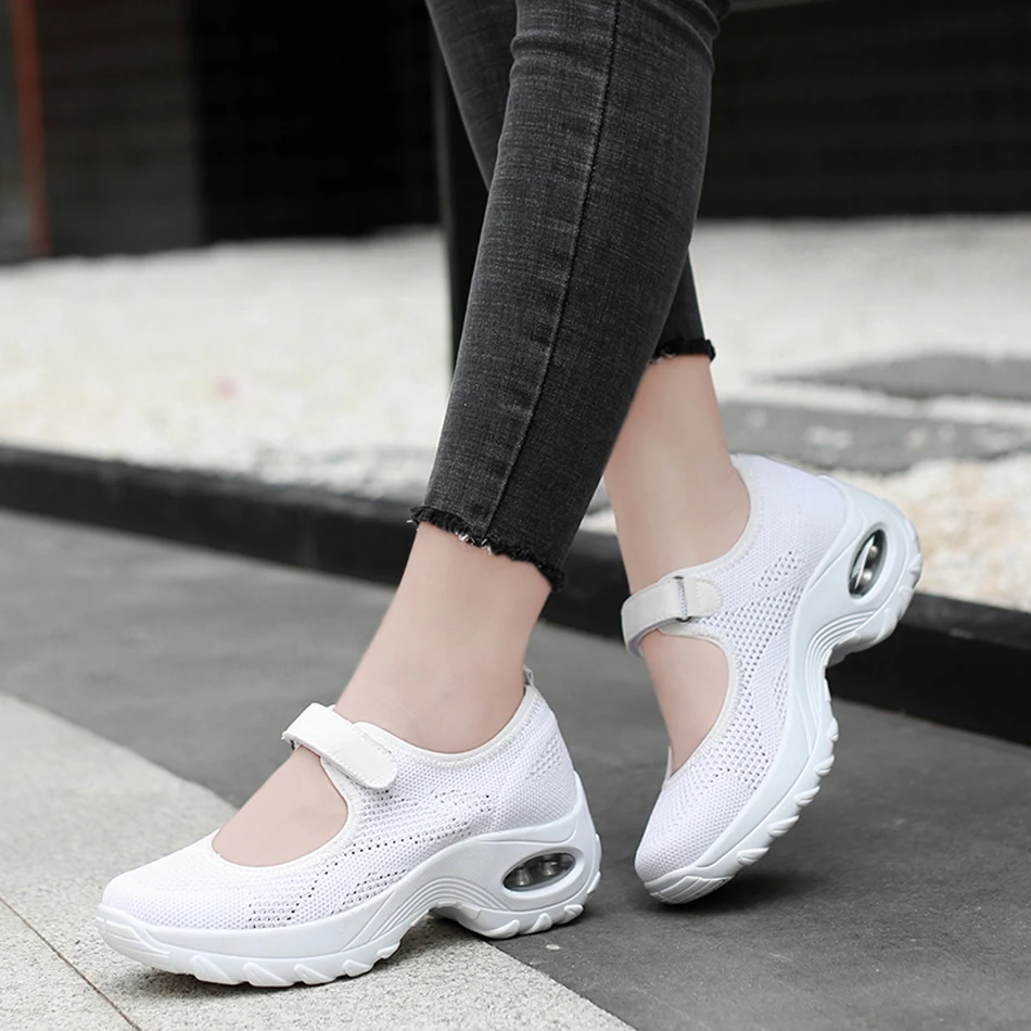 Кроссовки женские на танкетке, с воздушной подушкой, на липучке, Модные дышащие вязаные сетчатые лоферы, Вулканизированная подошва, белые