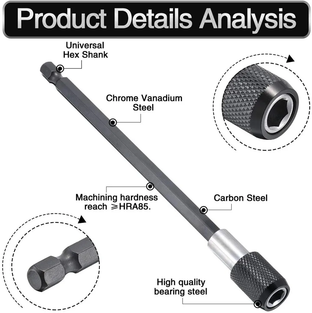 Подходит для: ① Диагональ диаметр шестигранным хвостовиком 1/4 дюймов или 6,35 мм. Внутренний шестигранник имеет сильный магнетизм. Особенности: интерфейс имеет механизм блокировки и встроенный сильный магнит, который является твердым и не отпадает.②Подходит для передачи электрической дрели, электрической/пневматической отвертки и т. Д., расширения преобразования различных бит и отверток, быстрой установки/разборки и повышения эффективности работы③Изделие изготовлено из хромовой ванадиевой стали и нагревается, чтобы сделать его более износостойким и не ржавеет