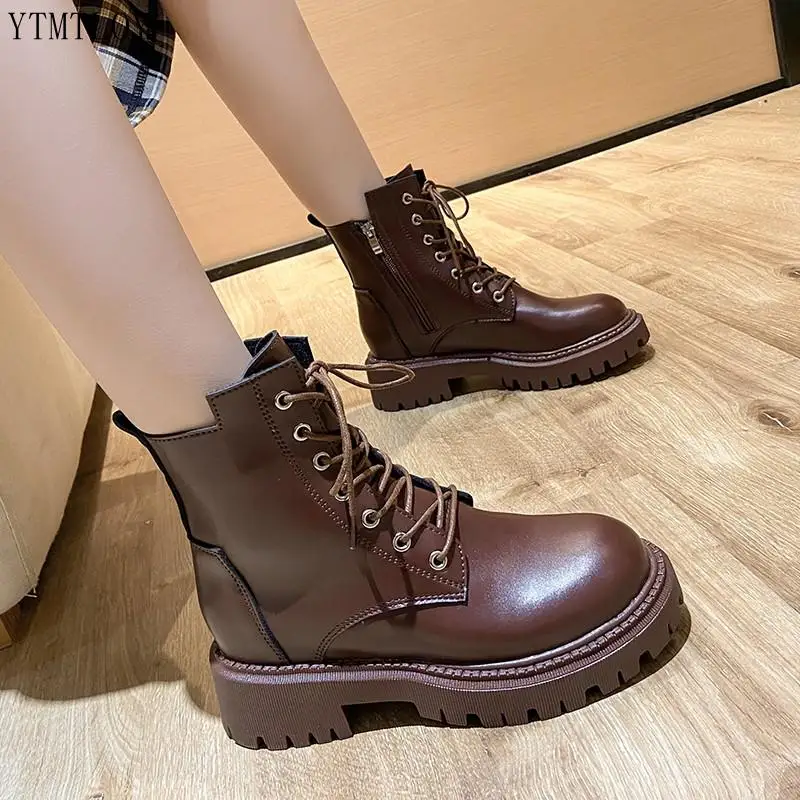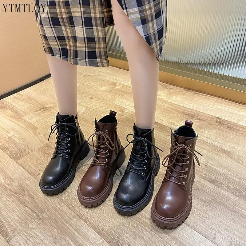 Женские ботинки на толстой подошве, короткие кожаные ботинки в британском стиле с круглым носком, квадратные, Осень-зима 2022