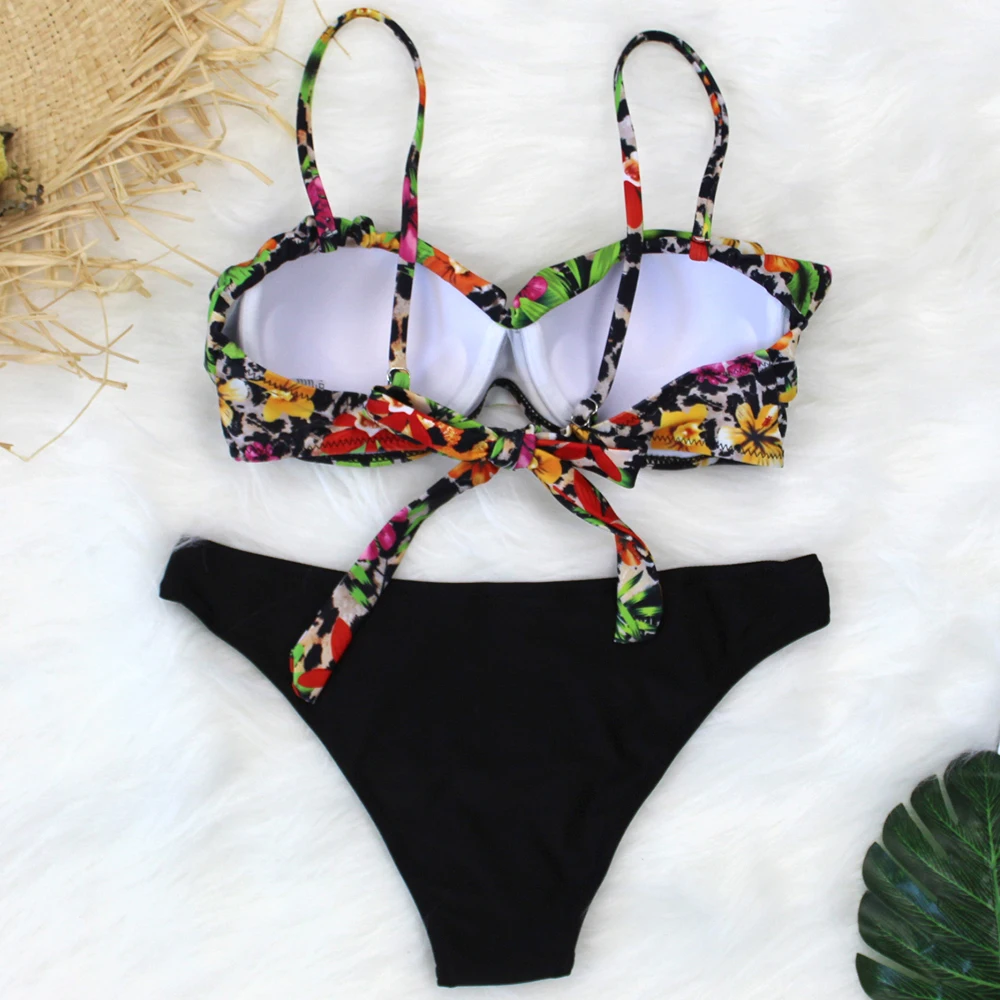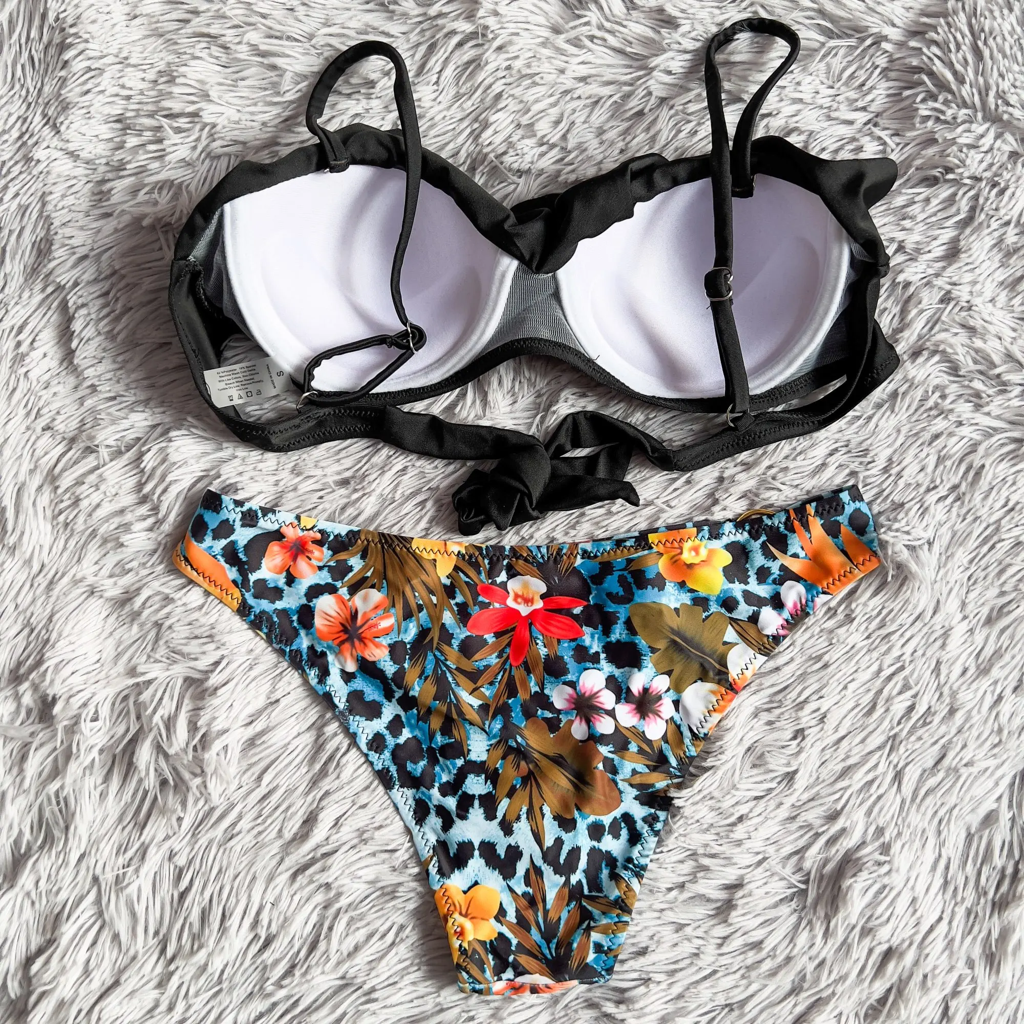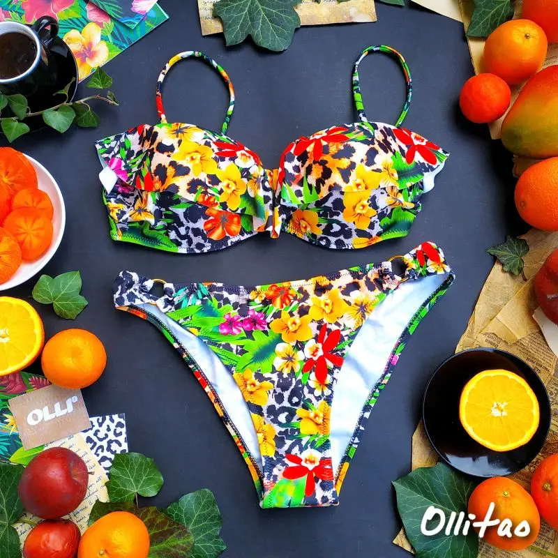 Яркий такой, да ещё и с кокетливыми рюшами. Мой вариант принт под леопардовый окрас и много цветов и листьев. Но на выбор у продавца 20 расцветок. Ткань: 82% полиэстер, 18% спандекс Купальник состоит из лифа и трусиков Лиф чашки сформированы, имеют форму и это не мягкий поролон. Есть косточки. Внутри лифа имеется подклад. В качестве декора на чашечке сверху волан. Сзади без застёжки, лиф просто завязывается. Удобно, каждый может подогнать под свои объёмы Лямки съёмные, с регулировкой длины. Фурнитура металлическая Швы нормальные. Особых косяков не заметила. Сшит лиф нормально. Внутри все аккуратно Трусики закрытые. По бокам в качестве декора золотые кольца. Внутри есть подклад. Была гигиеническая наклейка. Швы на трусах тоже норм. Сделаны аккуратно. Я взяла в размере M. Купальник сел хорошо, порадовал лиф и что можно подтянуть под свои параметры. Трусики в притык.