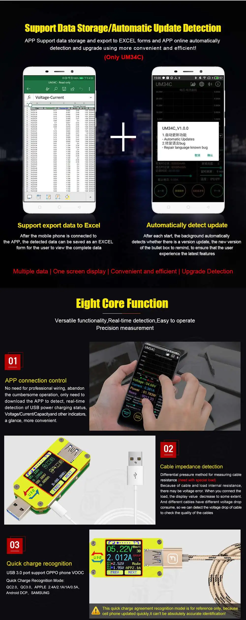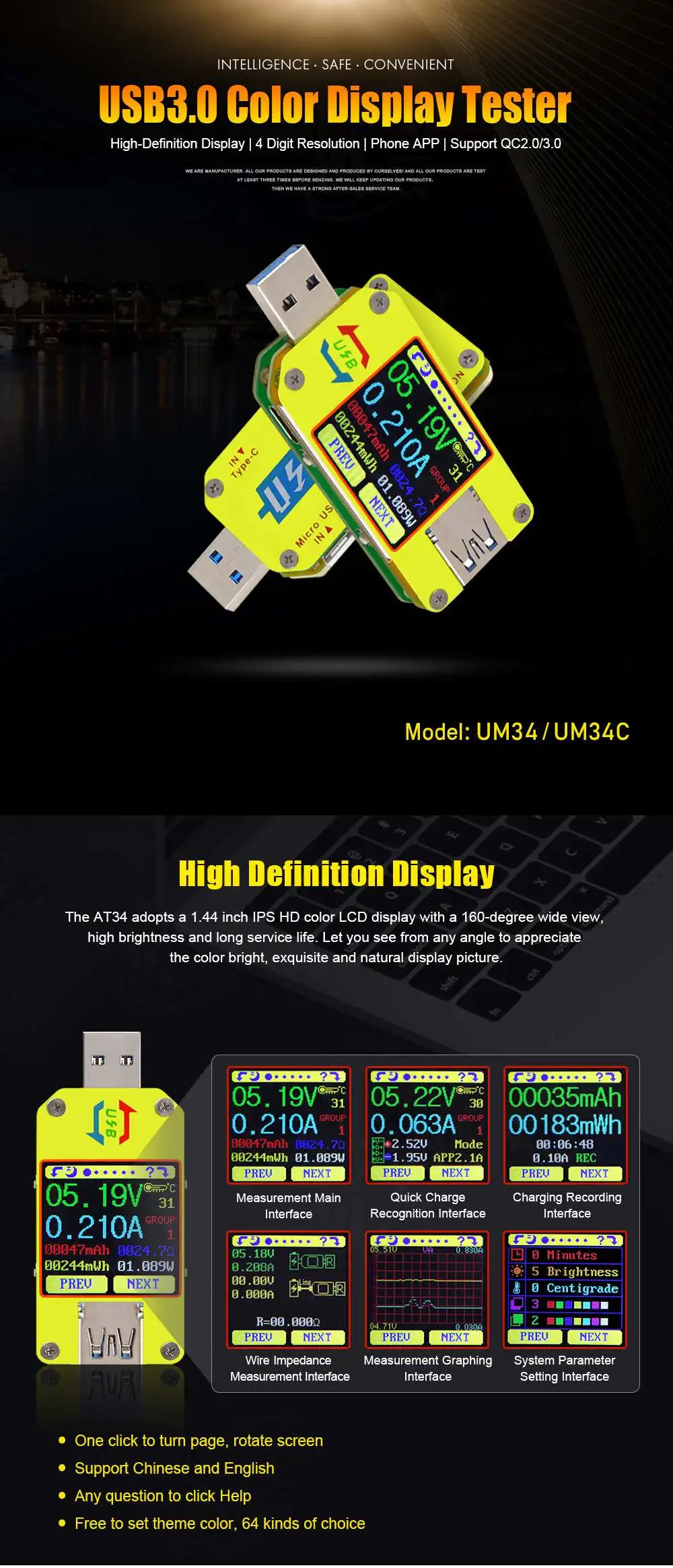 Технические параметры:Модель изделия: UM34 (тип A) / UM34C (тип B) Экран дисплея: 1,44 дюймовый цветной ЖК-дисплейНапряжение Диапазон измерения: от 4-24,000 V Напряжение Дискретность: 0,01 VДиапазон измерения тока: 0-5.0000A разрешение измерения тока: 0.001AНакопление емкости: 0-99999 мАч точность измерения напряжения: ±(0.2% + 1 цифра)Диапазон скакумуляции энергии: 0-999,99wh точность измерения тока: ±(0.8% + 3 знака)Диапазон сопротивления нагрузки: 0.8Ω-9999.9Ω диапазон измерения времени: 0-99h59min59sДиапазон температур:-10 ℃-100 ℃/0 ℉-200 error погрешность измерения температуры: ± 3 ℃/± 6 ℉Настройка яркости экрана: 0-5 уровней автоматическое выключение экрана: 0-9 минутДиапазон отображения напряжения: 0-24,00 в Диапазон отображения тока:-4.000AЧастота обновления: 2 Гц режим быстрой зарядки: QC2.0, QC3.0, APPLE 2.4A/2.1A/ 1A/0.5A, Android DCPРазмер продукта: 71,2 мм x 30,5 мм x 12,4 мм (UM34C)/71,2 мм x 30,5 мм x 11,3 мм (UM34)Вес изделия: 22,87 г (UM34C)/18,39 г (UM34) (без упаковки); 51,43 г (UM34C)/46,95 г (UM34) (с упаковкой)Примечание:1. UM34-это не версия связи, UM34C-это версия связи по bluetooth. И у UM34C нет программного обеспечения для ПК, есть только приложение для android.2. Телефон Android (Android 5,0 и выше, поддержка 18 языков, китайский, английский и русский ....)3. Руководство пользователя и приложение для Android Ссылка для скачивания: http://www.mediafire.com/folder/5c877rc21tp1p/UM344, для Android APP:О: приложение поддерживает только android 5,0 и выше.B: позволяет приложению делать в фоновом режиме, не очищать.C: позволяет самостоятельно запускать приложение.D: Позвольте приложению оставаться после блокировки экрана, не быть очищенным.