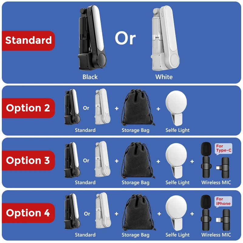 Вариант 4: Стандарт + сумка для хранения + Selfe свет + беспроводной микрофон (для Iphone смартфона)