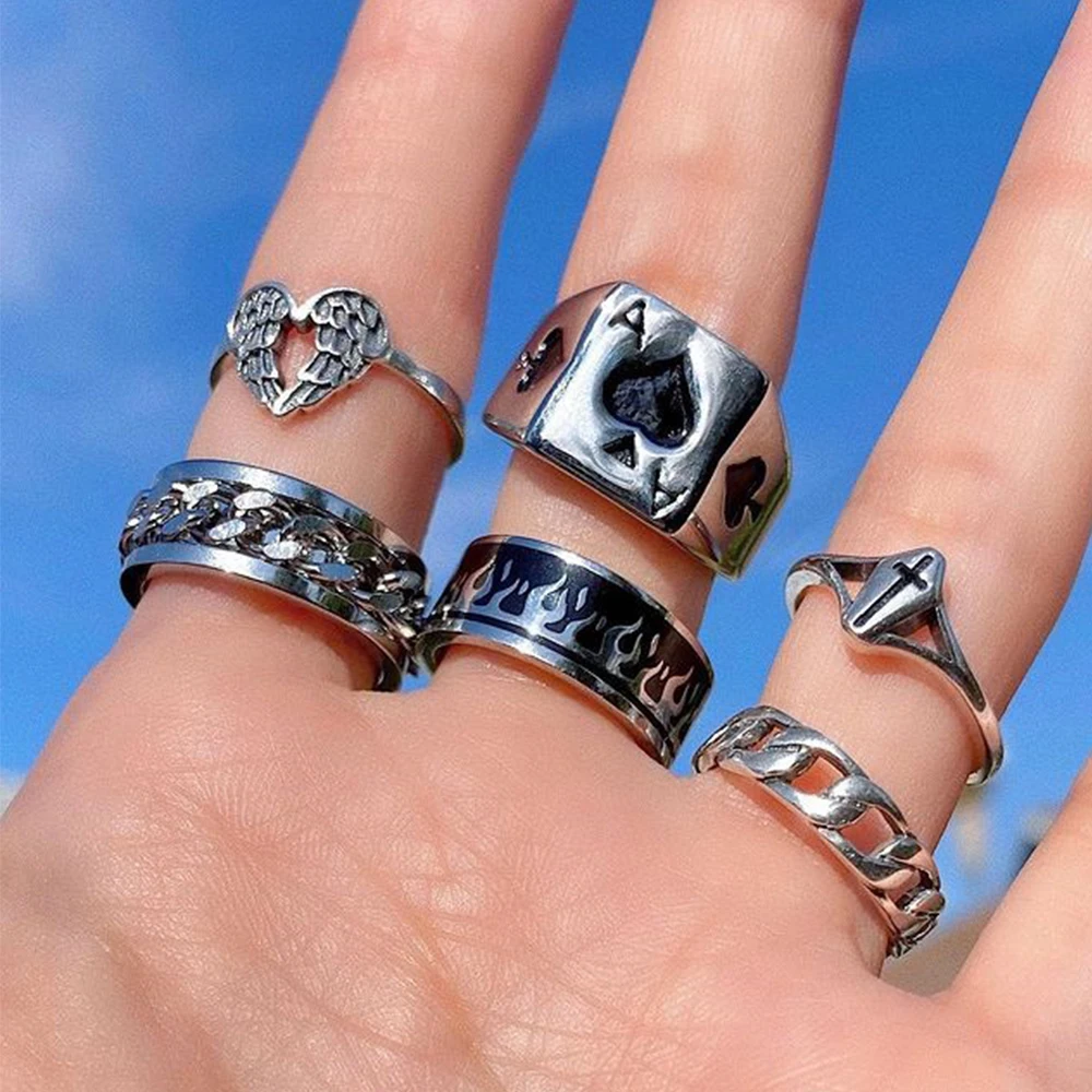 Женский комплект колец в стиле панк и готика, винтажная Посеребренная бижутерия в форме сердца с пентаграммой в виде пламени, очаровательные украшения для бильярда в стиле ретро
