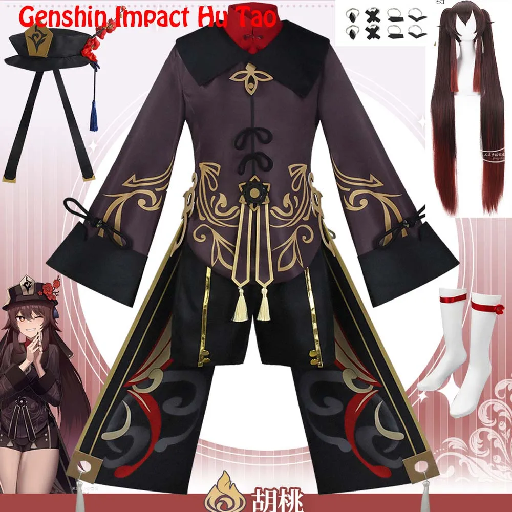 Костюм для косплея Ху Тао из игры Genshin Impact, одежда Ху Тао, толстовка форменная накидка, полный комплект на Хэллоуин, парик хутао, шляпа, аксессуары