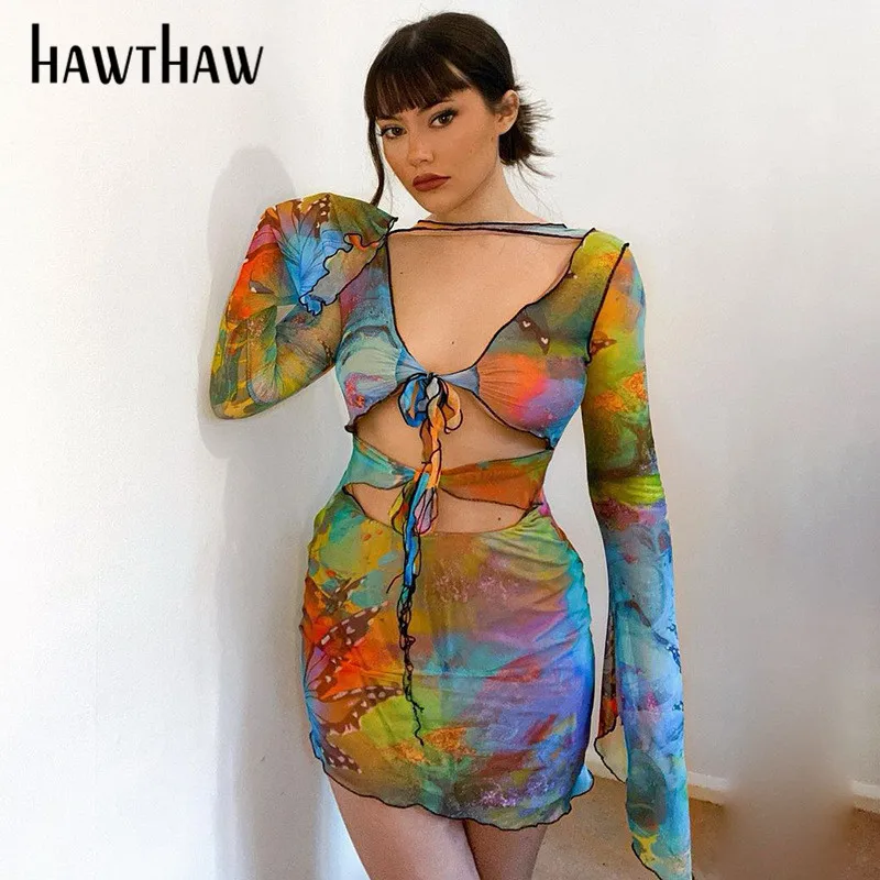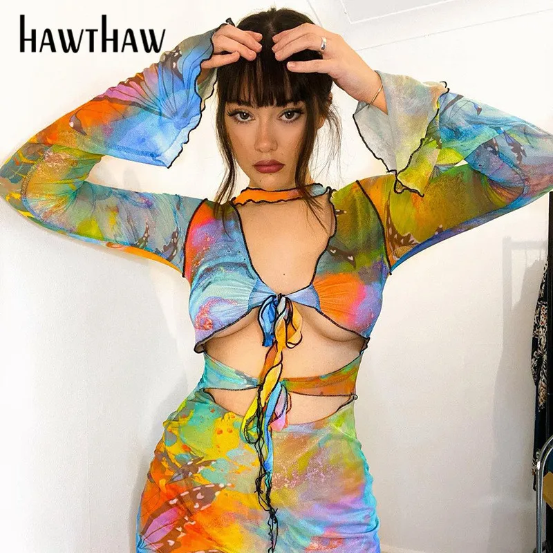 Женское осенне-зимнее облегающее Сетчатое Прозрачное мини-платье Hawthaw с длинным рукавом, осенняя одежда 2021, оптовая продажа товаров, уличная одежда