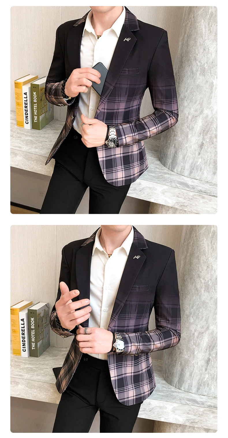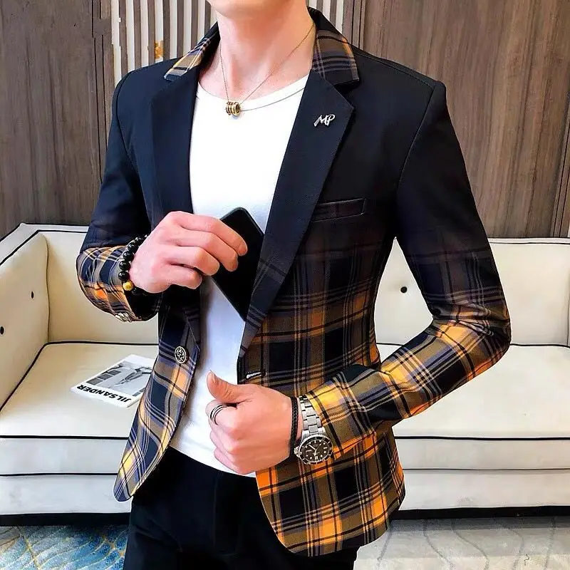 Весна-Осень 2022, Мужской Блейзер, модный приталенный клетчатый пиджак с цветными блоками, Мужская одежда для свадьбы и бизнеса, мужской костюм, пальто