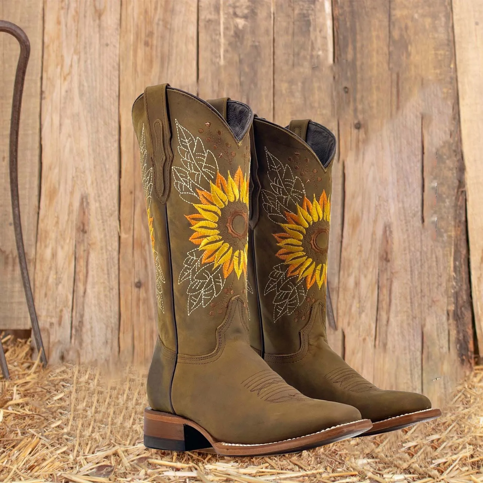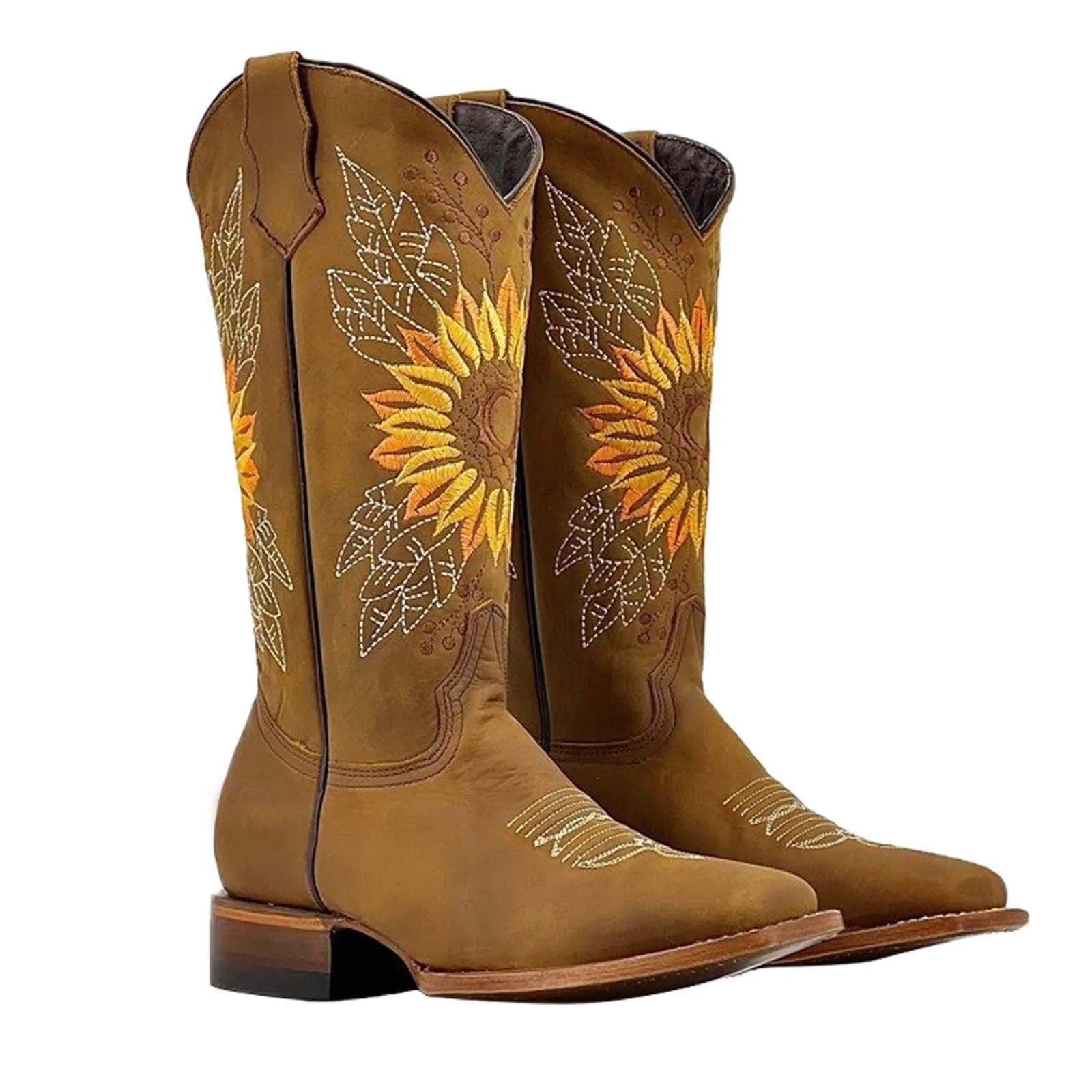 Женские ботинки 2022, осенние ботинки с вышивкой в виде подсолнуха, с острым носком, без застежки, ковбойские ботинки до середины икры, водонепроницаемые, Laides зимняя обувь