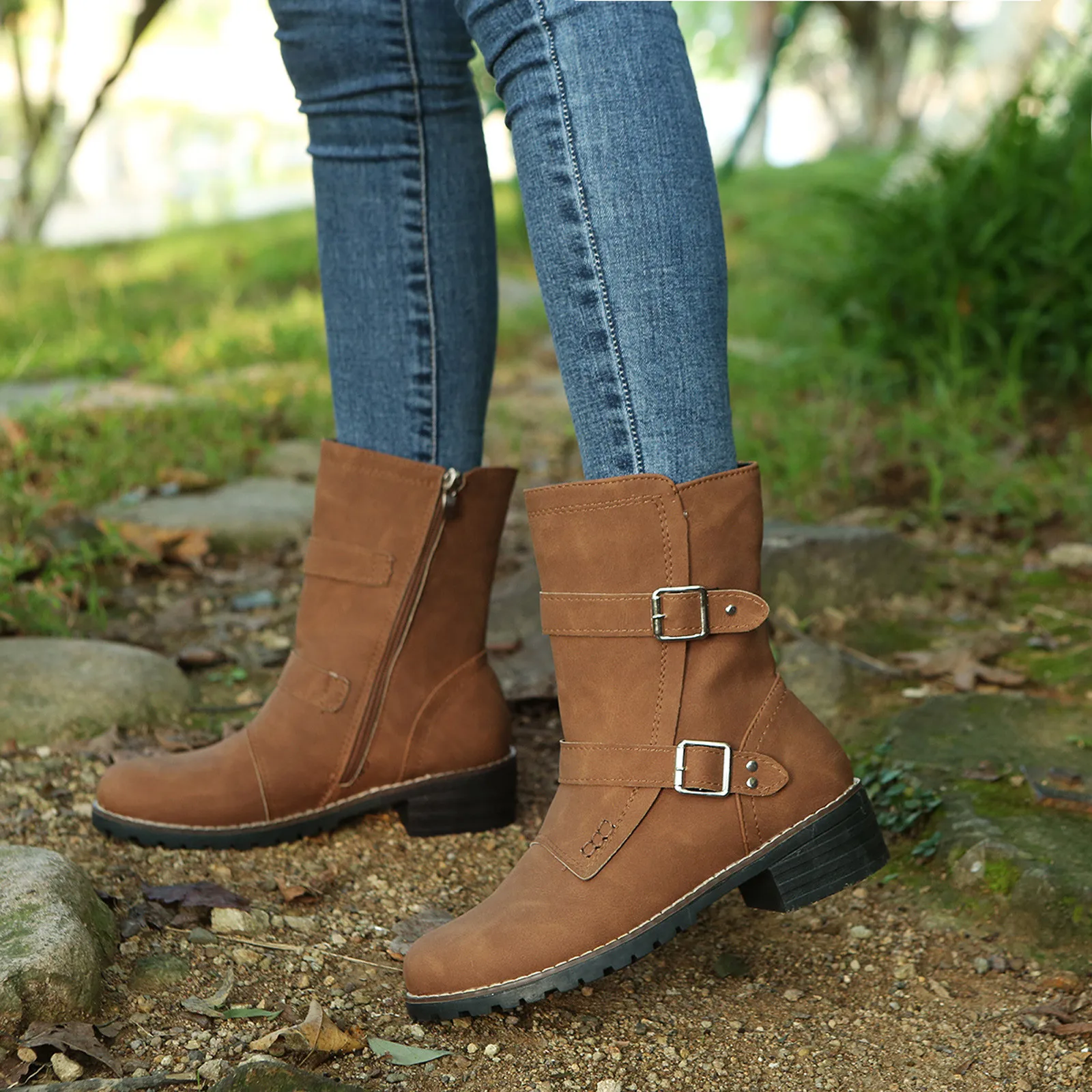 Женские кожаные ботильоны на плоской подошве, с металлической пряжкой и средним рукавом, модные теплые зимние ботинки, Размеры 35-42