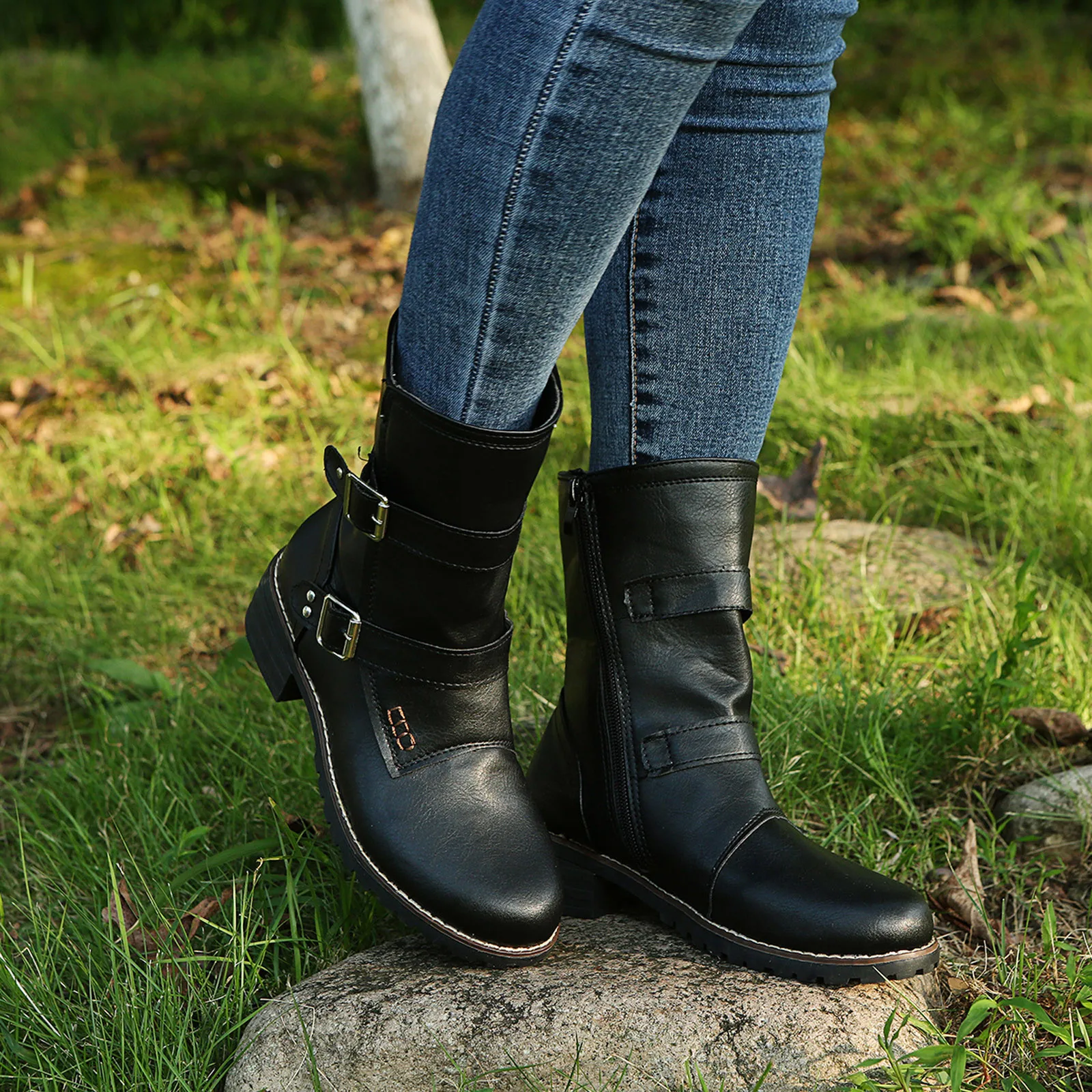 Женские Модные кожаные ботинки на плоской подошве с металлической пряжкой и средним рукавом