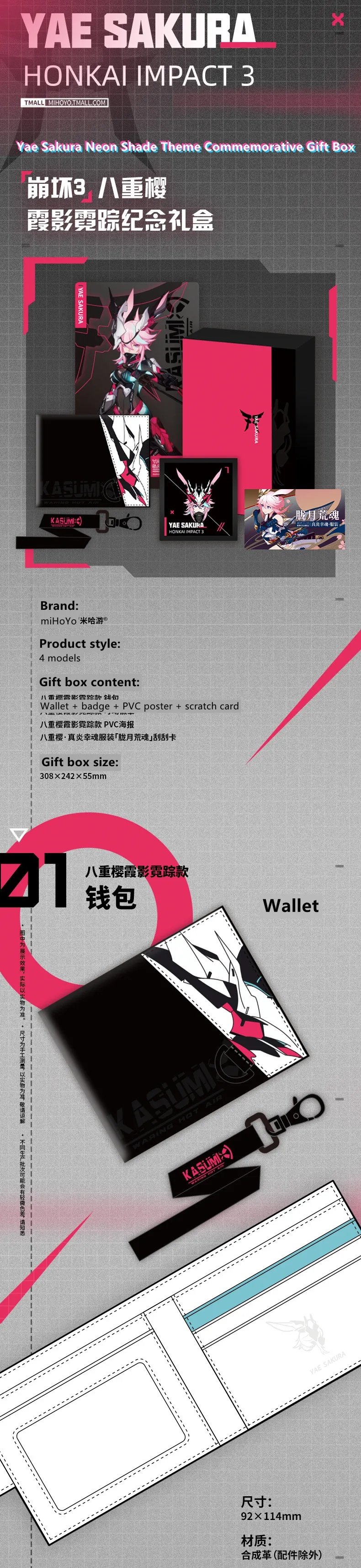 Аниме игра Honkai Impact 3 Косплей Yae Sakura неоновый тени тематическая серия Подарочная коробка (кошелек + значок + плакат из ПВХ + карта для царапин)