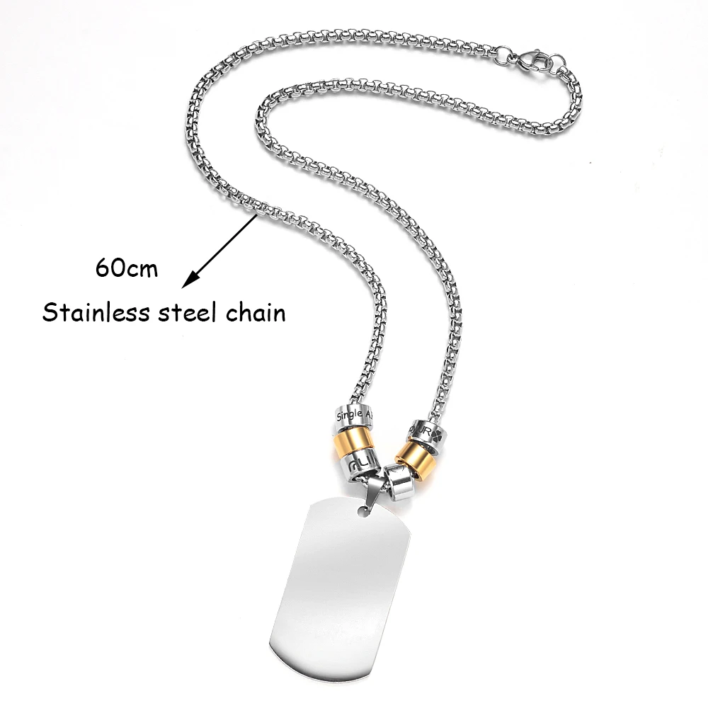 Материал: нержавеющая стальДлина цепочки: 50 см/60 смФорма: Круглый квадратныйЦвета: серебристый/черныйПосылка включает в себя: 1 ожерелье на заказ