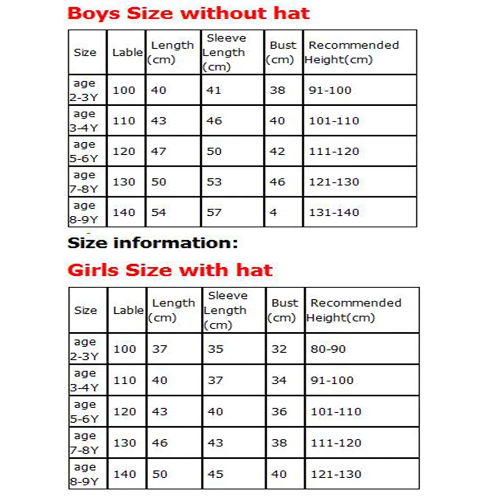 Размеры Лабле Длина (см) Длина рукава (см) Бюст (см) Рекомендуемая высота (см) Возраст От 2 до 3 лет 100 40 41 38 91-100 Возраст От 3 до 4 лет 110 43 46 40 101-110 Возраст От 5 до 6 лет 120 47 50 42 111-120 Возраст От 7 до 8 лет 130 50 53 46 121-130 Возраст От 8 до 9 лет 140 54 57 4 131-140 Обратите внимание: 1. Все продукты являются измерениями плитки, пожалуйста, учитывайте погрешность в 1-3 см. 2. Пожалуйста, при покупке выбирайте размер в соответствии с таблицей размеров. Если вы не понимаете их, пожалуйста, свяжитесь с нами. Сообщите нам вес и рост ваших детей. Мы поможем вам сделать лучший выбор. 3. Светильник причина фотографии и в натуральной форме, у вас есть s светильник цвет, просим отнестись к этому с пониманием!