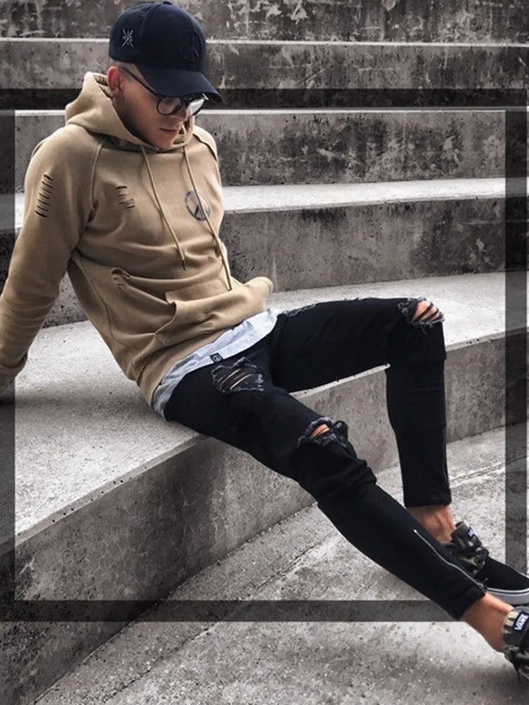Мужские зауженные джинсы, рваные черные зауженные брюки с дырками