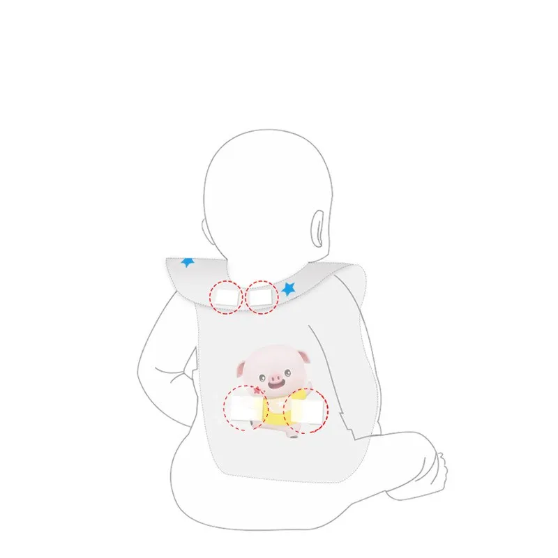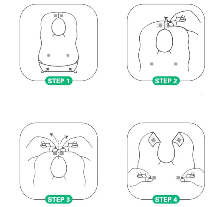 1. Поверните направление Биб на лицевую сторону. Отрегулируйте положение рта.2. Пожалуйста, Оторвите бумагу в положении шеи нагрудников.3. Пожалуйста, разделите нагрудники на две стороны вдоль линии расчистки. Он может быть наклеен на одежду в положении плеча на задней стороне.4. Пожалуйста, Оторвите бумагу в положении талии. Приклеиваемые нагрудники на лицевой стороне, чтобы предотвратить любое движение.Как показано ниже.
