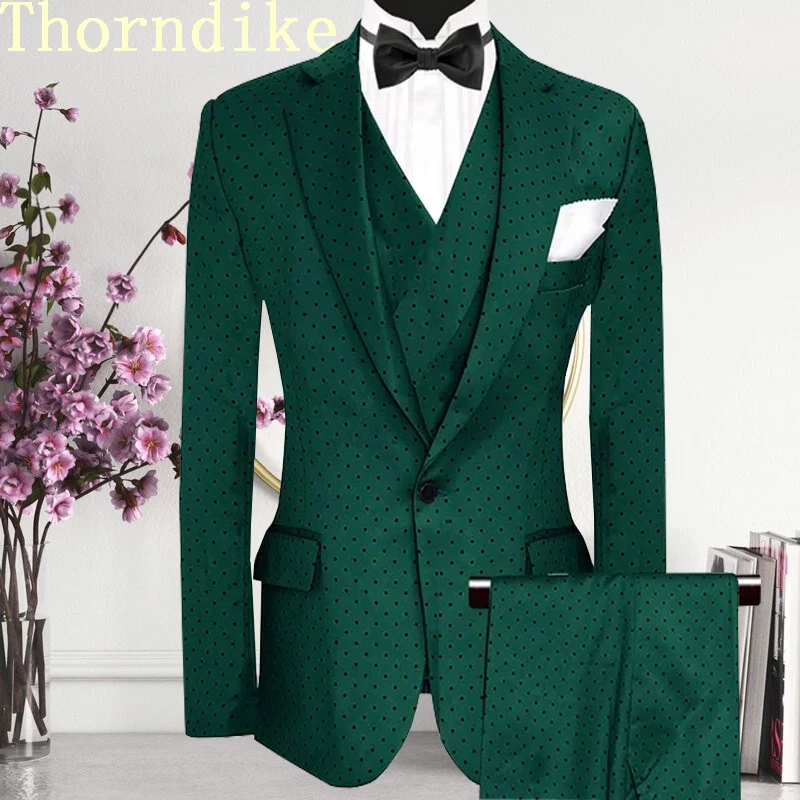 На заказ темно-зеленые костюмы в горошек для мужчин 3 предмета (пиджак + брюки + жилет) повседневный свадебный блейзер жениха смокинг на заказ для мужчин для свадьбы