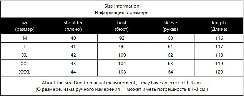 2XLШирина плеч: 43 смОбхват груди: 104 смРукав: 63 смДлина: 119 см3XLПлечо: 44 смОбхват груди: 108 смРукав: 64 смДлина: 120 см