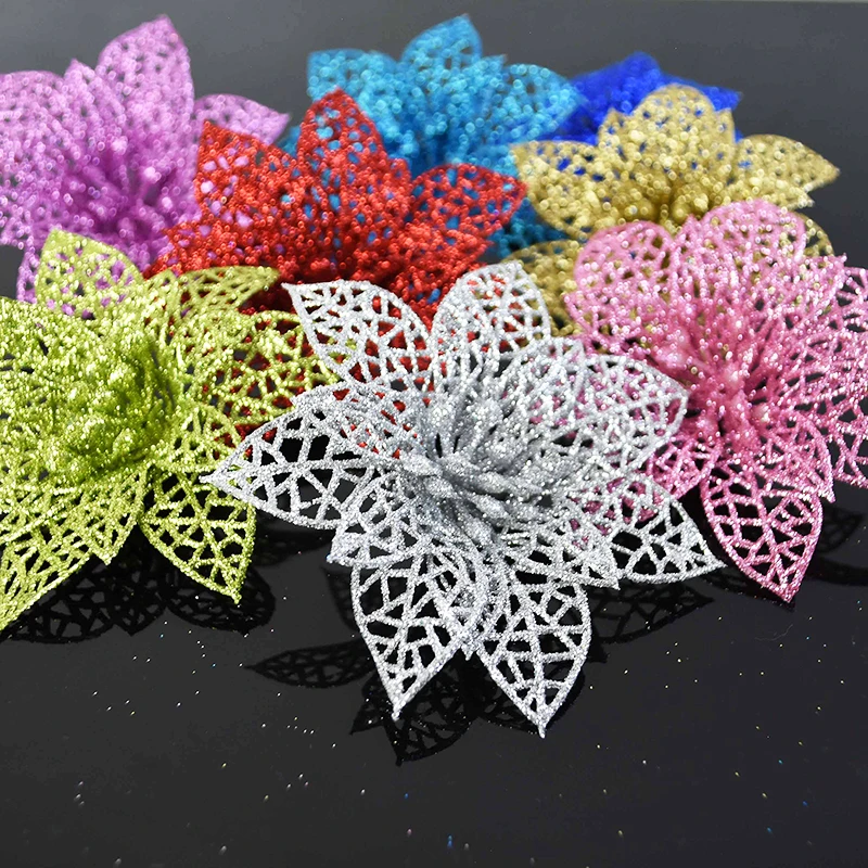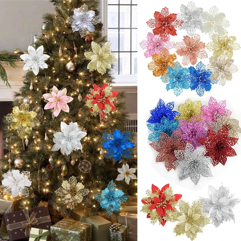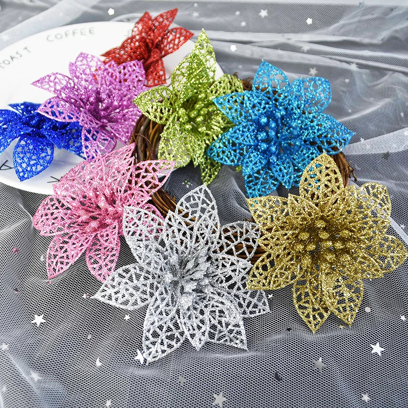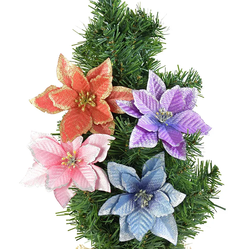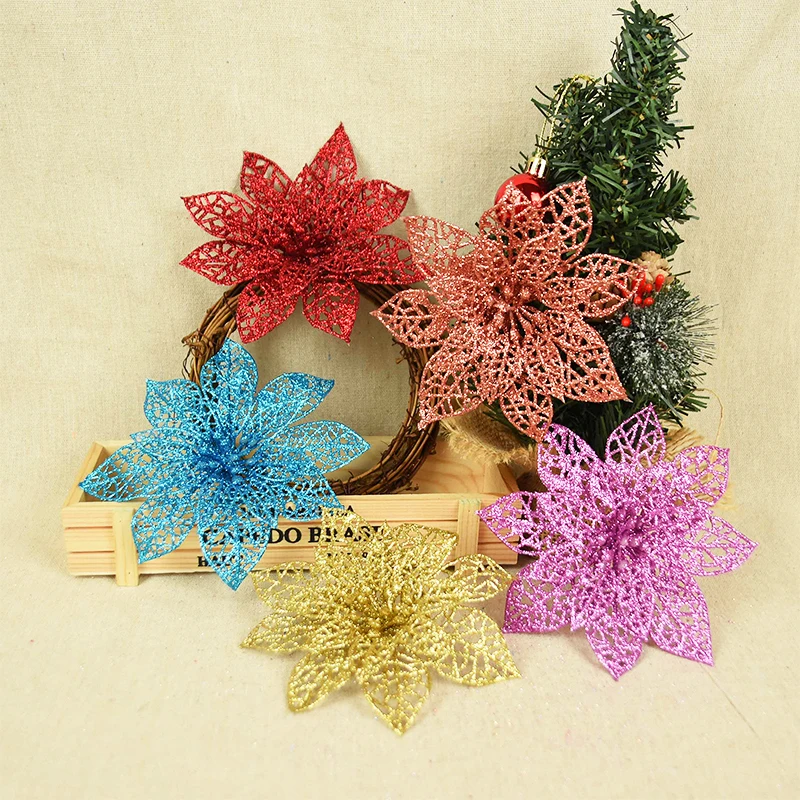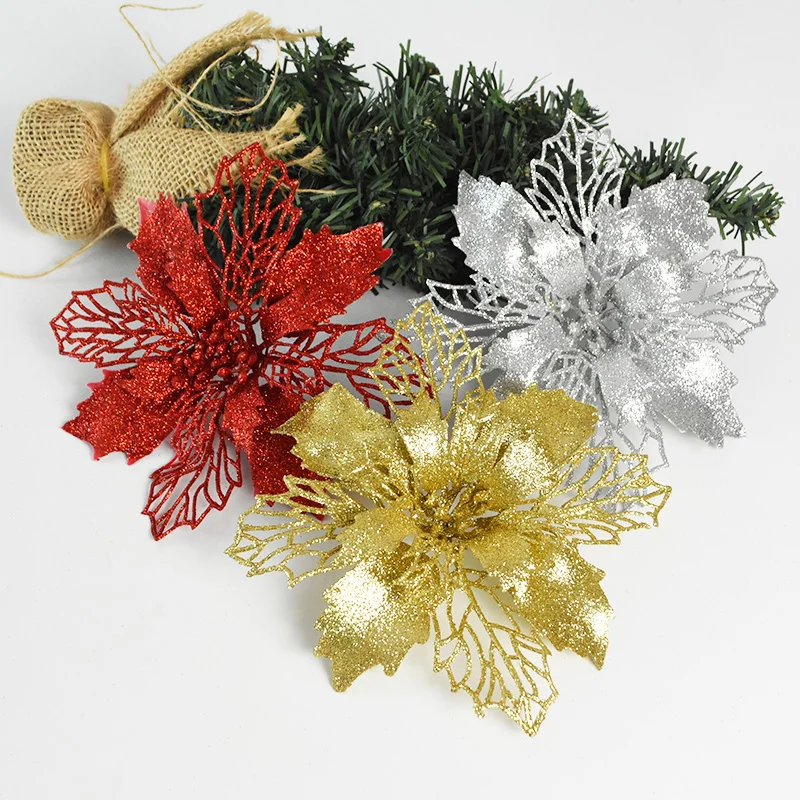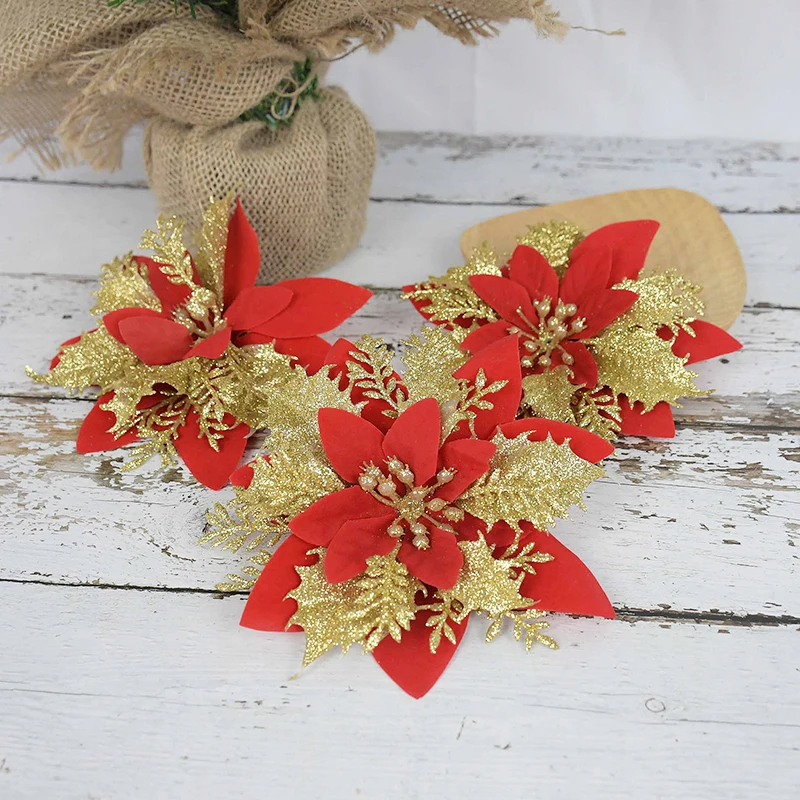 5 шт.лот блестящие рождественские Пуансетии искусственные цветочные головки для свадебвечерние, Рождественское украшение для дома, украшение для рождественской елки