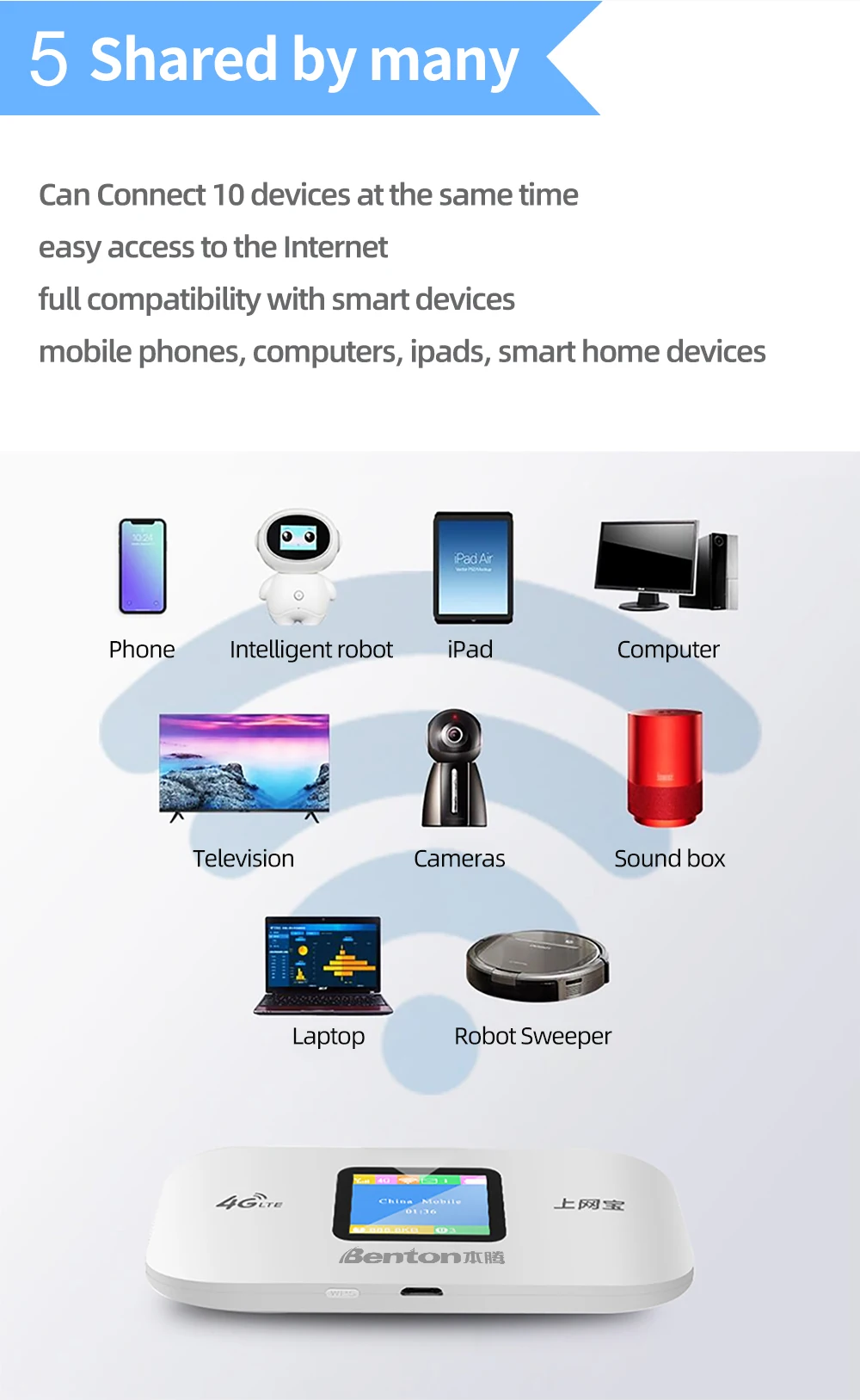 Можно подключить 10 устройств одновременно10s доступ к ИнтернетуПолная совместимость с смарт-устройствамиМобильный телефон, компьютеры, Ipad, устройства умного дома