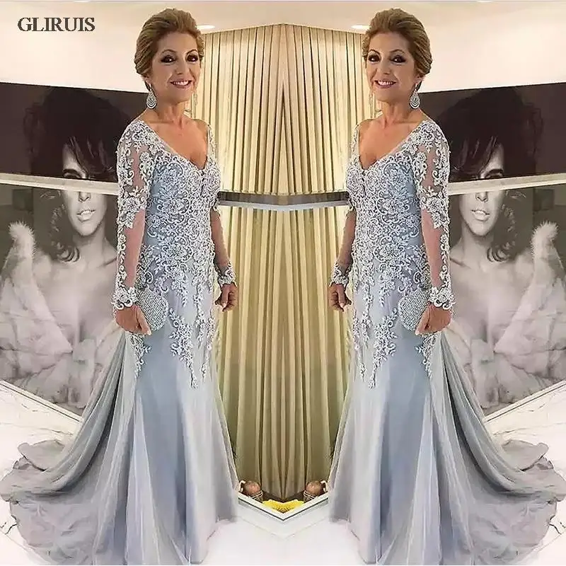 Элегантные Синие серебряные платья для матери невесты с длинным рукавом 2021 V-образным вырезом Женские платья Свадебные платья для гостей Новинка
