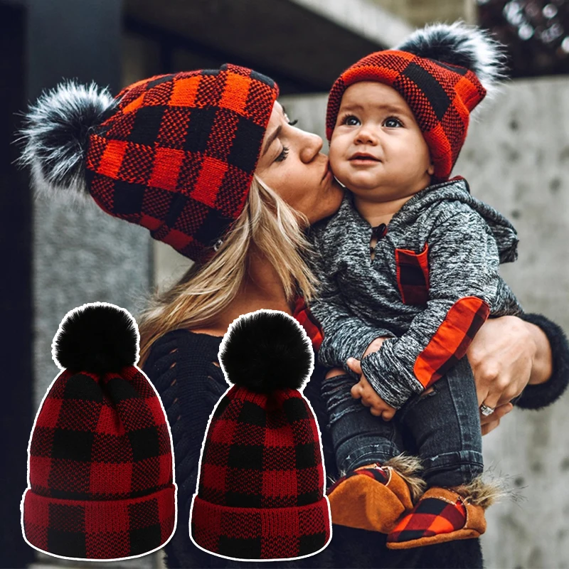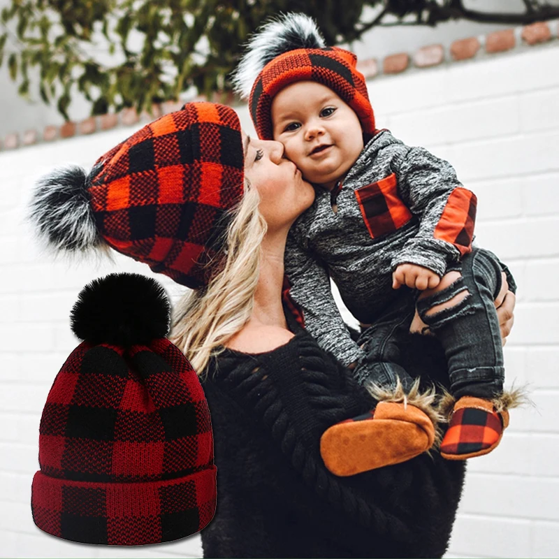 Новинка 2022, плотная женская шапка, шапка с меховым помпоном, зимняя шапка для мам, малышей, дочери, сына, шапка, детские вязаные шапочки, шапка
