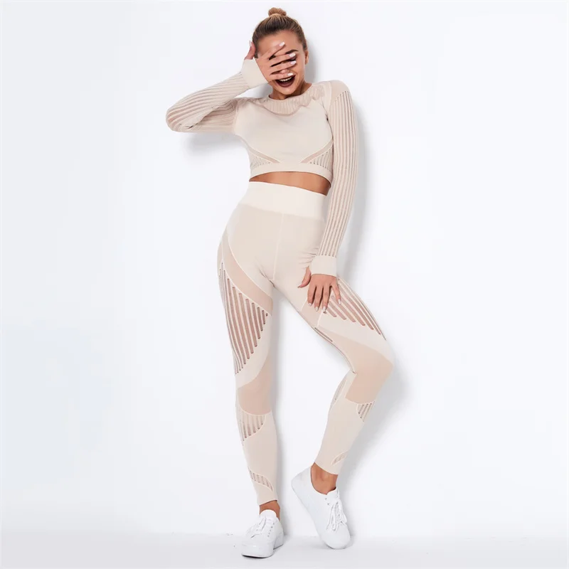 Тренировочная одежда для женщин, бесшовный ажурный костюм для йоги с длинными рукавами, укороченный топ с длинным рукавом, леггинсы с высокой талией, спортивный комплект
