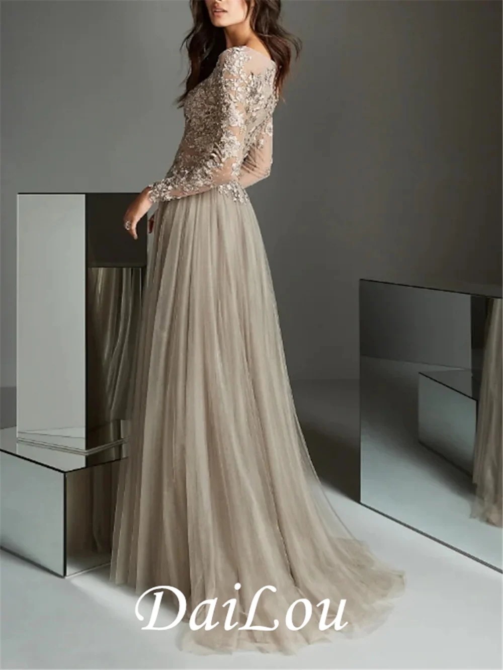 Повод: Свадебный Гость, официальный ВечерСтиль: элегантныйСилуэт: трапециевидныйПодол/поезд: развертка/щетка поездВырез: Иллюзия шеиТкань: тюль, кружевоЗастежка: Закрытая кнопкаДлина рукава: длинный рукавУкрашение: складки, аппликации