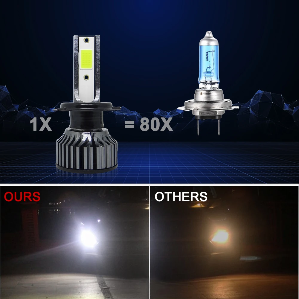 Высокие Люмены:Используется высококачественная светодиодная микросхема, высокая светоотдача.80W @ 20000LM каждая лампа, всего 80W @ 20000LM за пару, в 5 раз ярче галогенных лампВысококачественный светодиодный чип и долгий срок службы; Прочная фиксация заклепок(Многие другие чипы автомобильных фар фиксируются винтами; Их легко отвалить)Материал:Автомобильные лампы для фар из алюминиевого сплава полезны для рассеивания тепла и длительного срока службы.