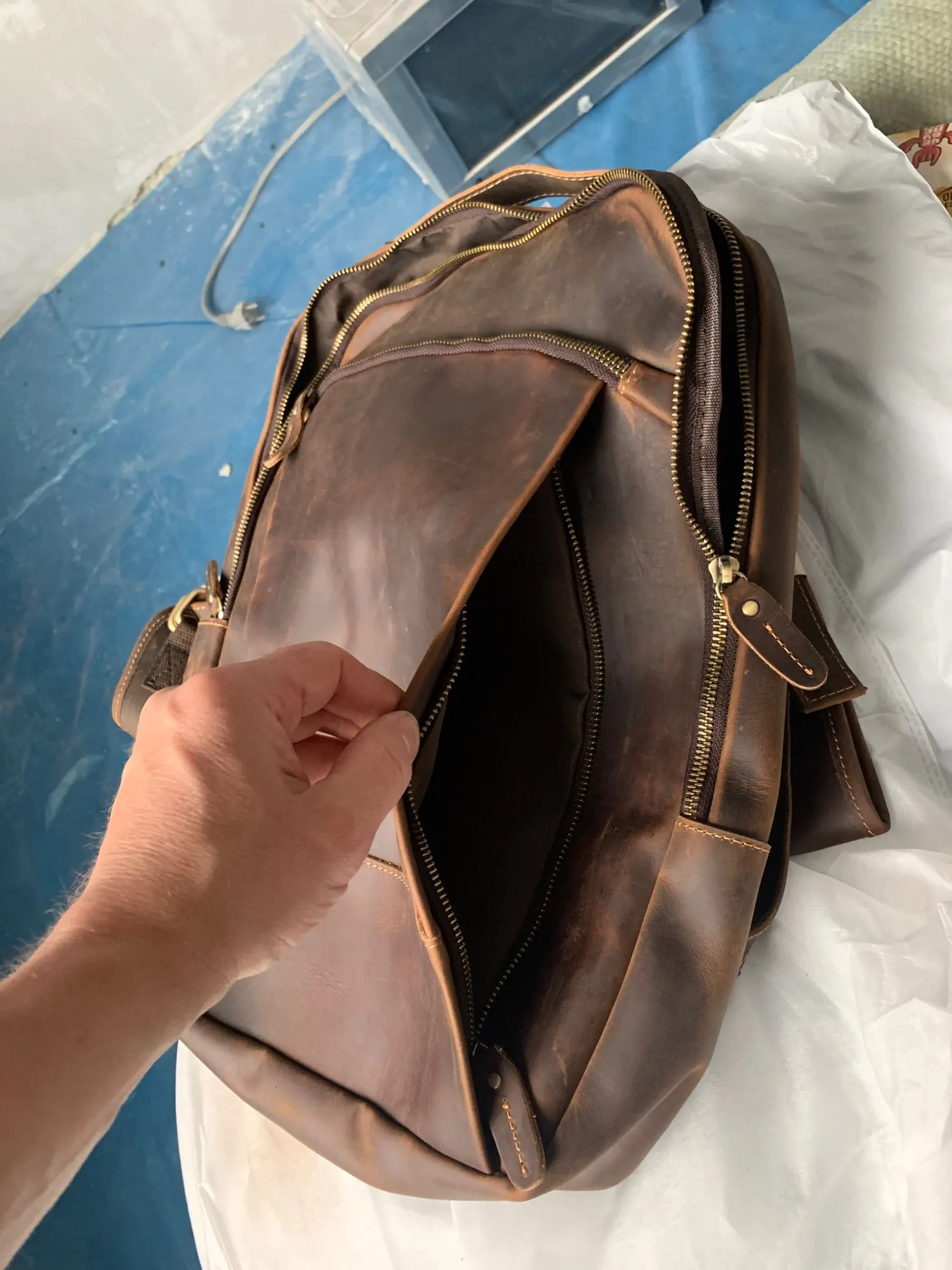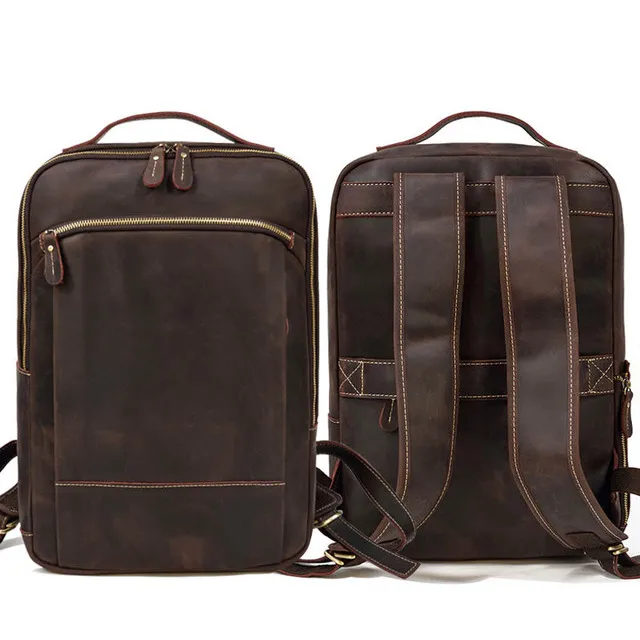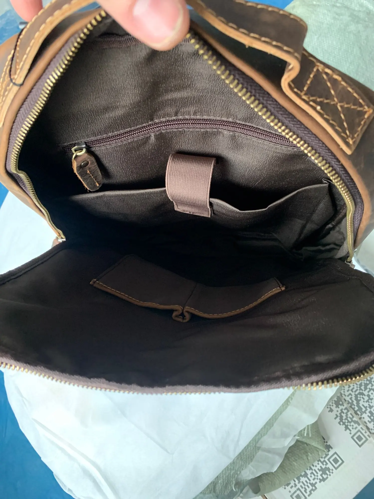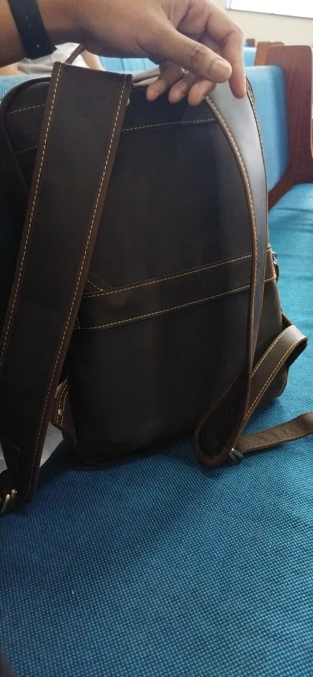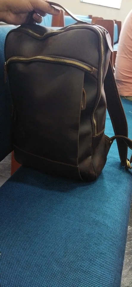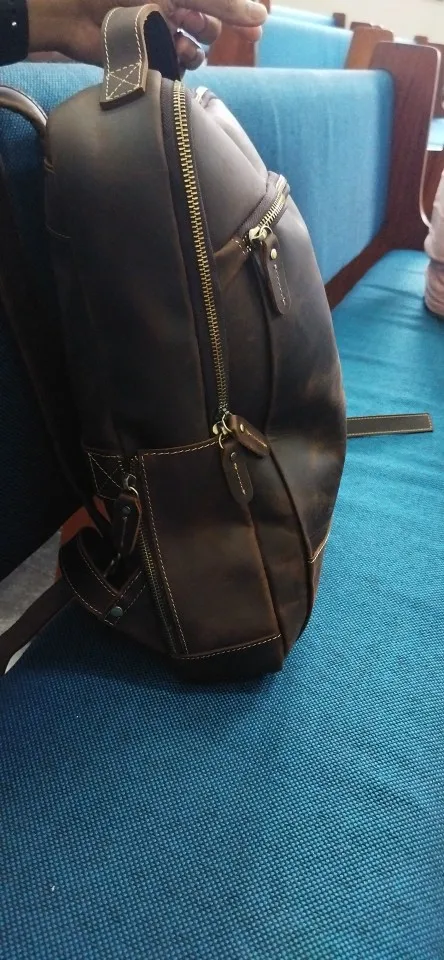 Рюкзак очень крутой, качество на высоте (ровные строчки, нитки ни где не торчат), я очень доволен. Смотрится дорого-богато. Брутальная толстая кожа, тракторные замки золотого цвета хорошо сочетаются с темно коричневым цветом