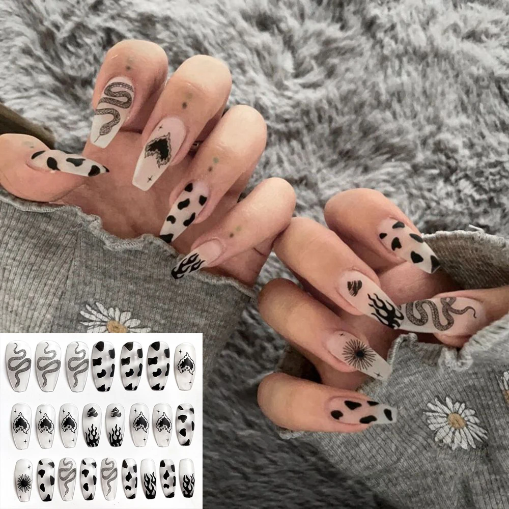 24 шт леопардовая тема полное покрытие накладные ногти Советы 2021 новый стиль черный коричневый прозрачный шпилька французский жемчуг поддельные ногти с клеем
