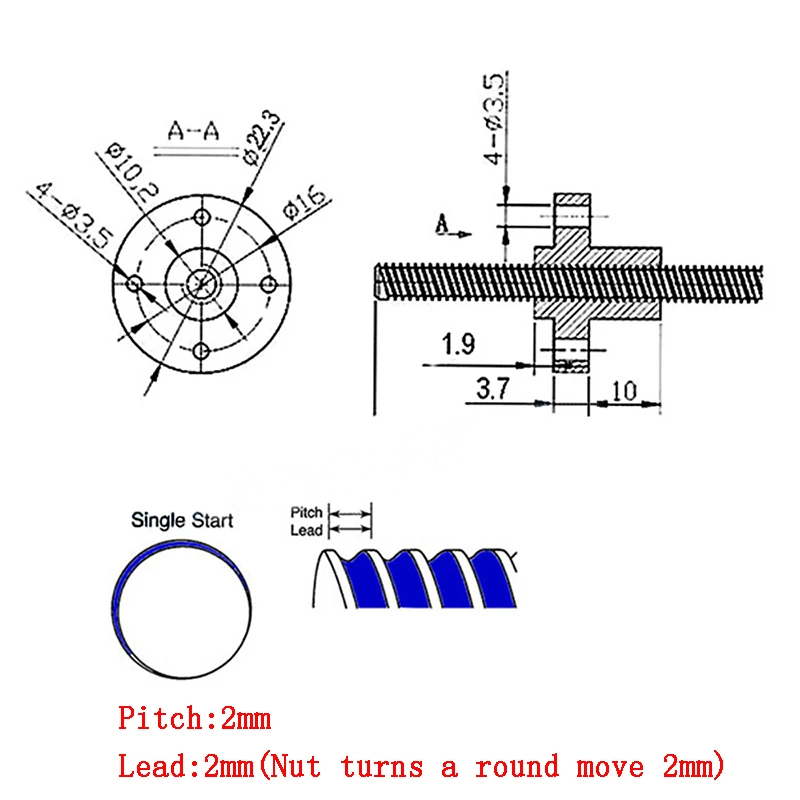 Шаг = 2 мм, свинец = 2 мм(Гайка поворачивает круг двигается 2 мм)