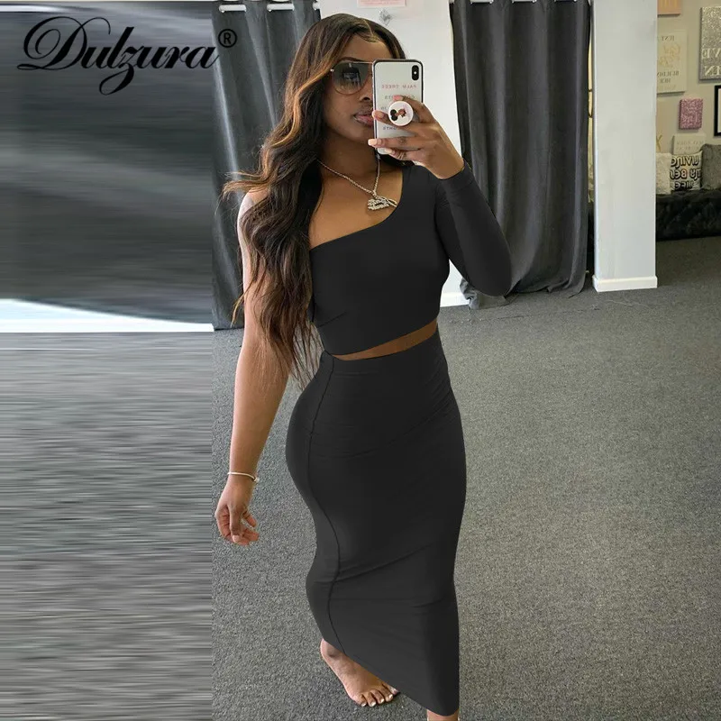 Женский комплект из двух предметов Dulzura, укороченный Топ с длинным рукавом, на одно плечо, элегантная юбка миди, облегающая Сексуальная уличная одежда, осень-зима