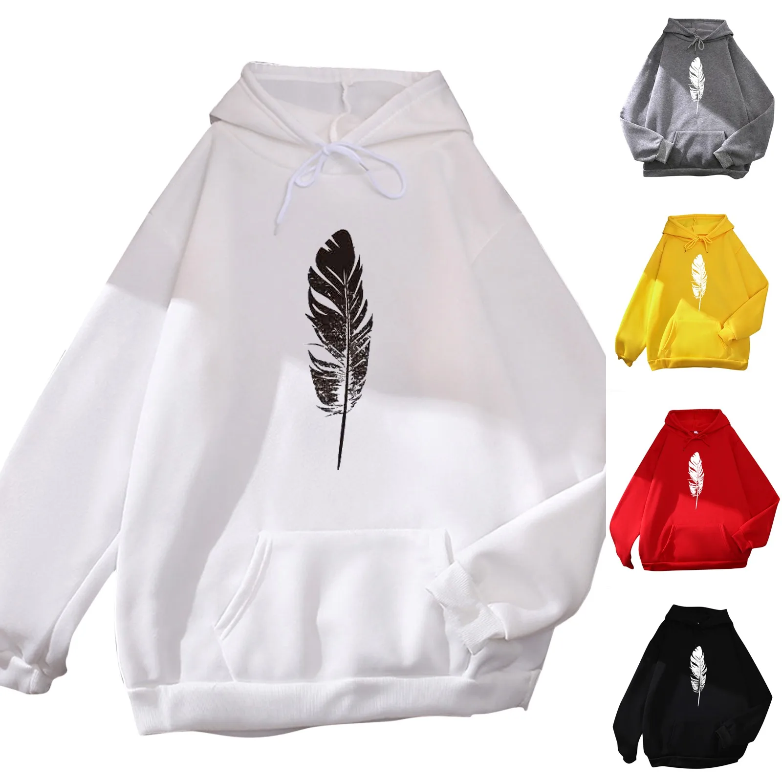 Женские толстовки с принтом перьев, повседневный Свободный Топ большого размера с длинным рукавом, свитшот с капюшоном и карманами, уличная одежда на шнурке