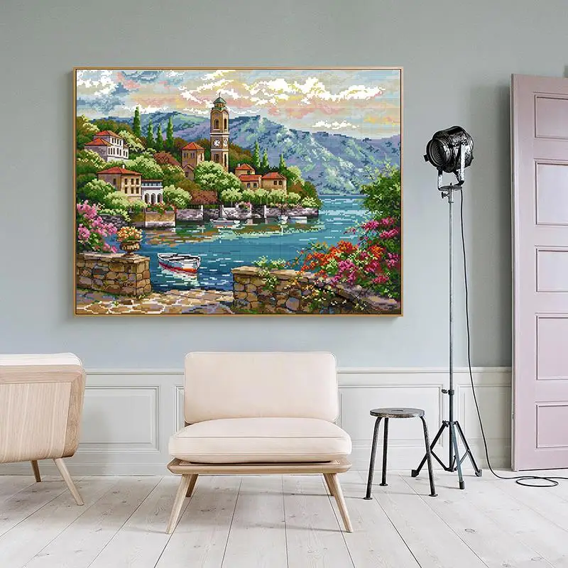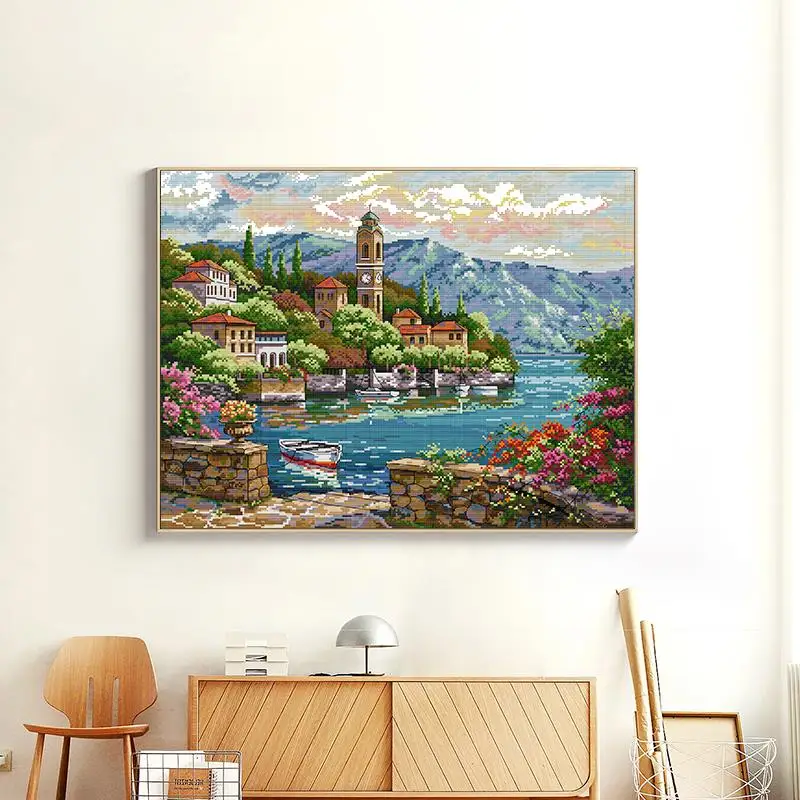 Часы с изображением моря, башни, крестиком, набор Aida 11CT 14CT, счетный холст, печать, вышивка, сделай сам, пейзаж, узор, ручная работа, набор для шитья