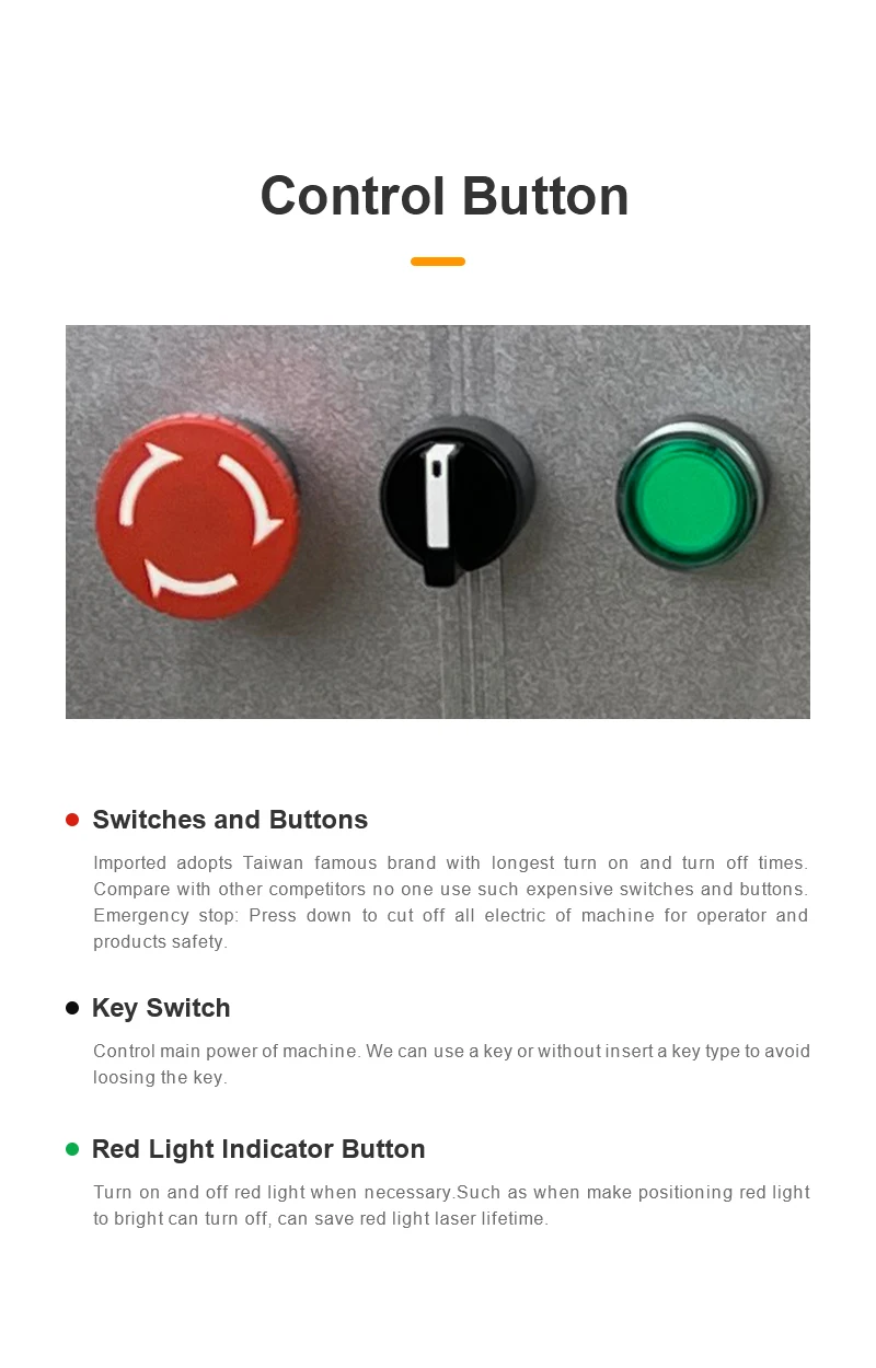 Переключатели и кнопки: импортированные из Тайваня известные бренды с самым длинным временем включения и выключения. По сравнению с другими конкурентами никто не использует такие дорогие переключатели и кнопки. Аварийная остановка: нажмите вниз, чтобы отрезать все электрические машины для безопасности оператора и продуктов. Клавишный переключатель: Управление основной мощностью машины. Мы можем использовать ключ или без вставки типа ключа, чтобы избежать потери ключа. Красный светильник Кнопка индикатора: включить и выключить красный светильник при необходимости. Например, когда вы делаете позиционирование красный светильник яркий может выключить, может сохранить красный светильник срок службы лазера.