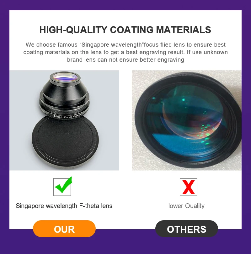 Мы выбираем знаменитые линзы с фокусным расстоянием “длина волны Сингапура”, чтобы обеспечить наилучшие материалы для покрытия линз, чтобы получить лучший результат гравировки. При использовании неизвестного бренда линзы не могут обеспечить лучшую гравировку